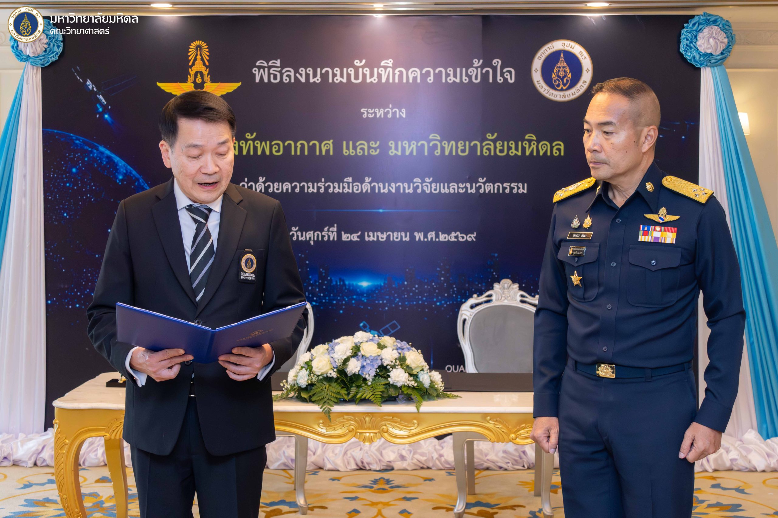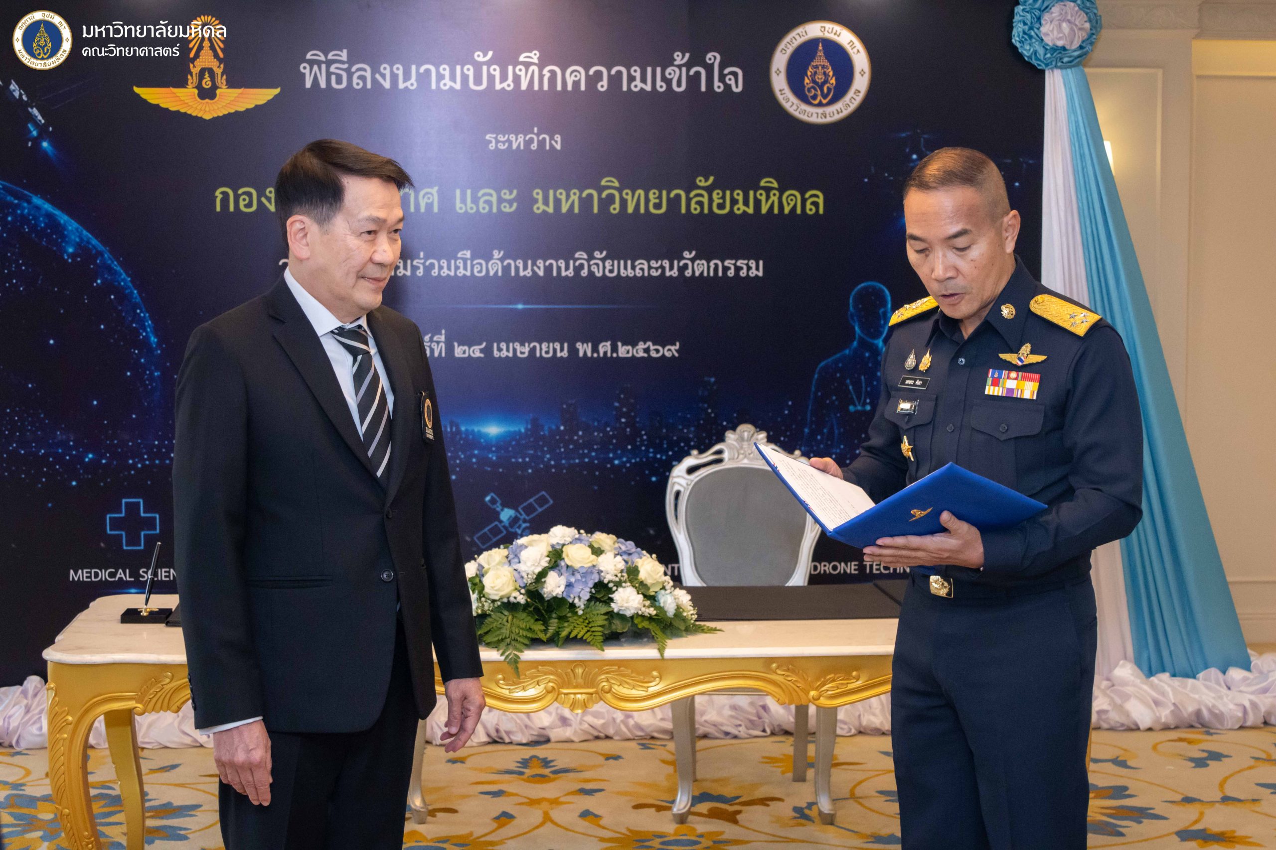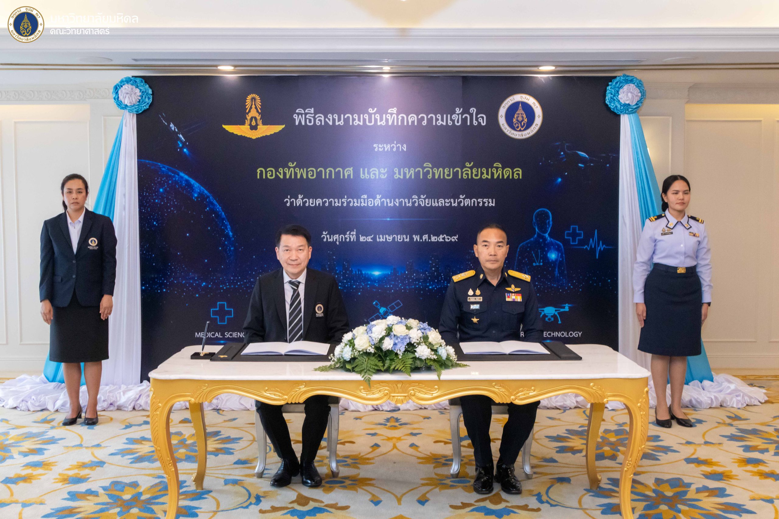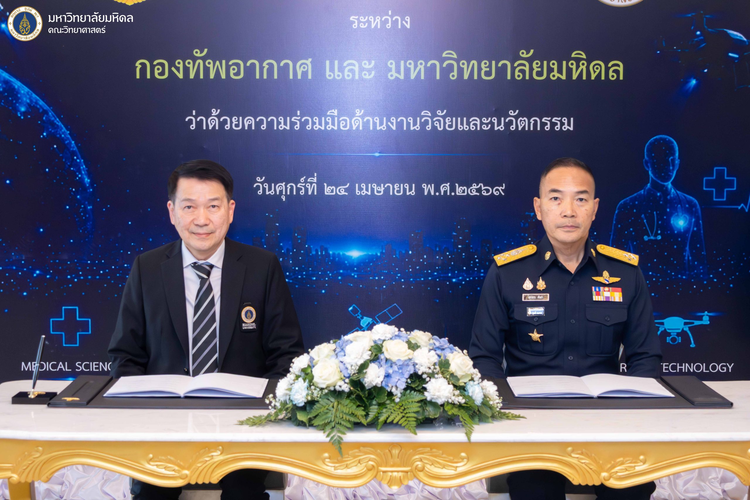 24 เมษายน 2569 มหาวิทยาลัยมหิดล พร้อมด้วย คณะวิทยาศาสตร์ คณะวิศวกรรมศาสตร์ และ คณะเทคโนโลยีสารสนเทศและการสื่อสาร ร่วมกับ กองทัพอากาศ ร่วมลงนามบันทึกข้อตกลงความร่วมมือด้านการวิจัยและนวัตกรรม ณ ห้องรับรองบริพัตร กองบัญชาการกองทัพอากาศ โดยมีวัตถุประสงค์เพื่อกำหนดกรอบความร่วมมือระหว่าง มหาวิทยาลัยมหิดล และ กองทัพอากาศ ในการพัฒนาองค์ความรู้ด้านการวิจัยและนวัตกรรมที่เกี่ยวข้องกับภารกิจด้านความมั่นคงและวิทยาศาสตร์ขั้นสูง รวมไปถึงการส่งเสริม สนับสนุน และประสานความร่วมมือเกี่ยวกับผลงานวิจัยและนวัตกรรมด้านเทคโนโลยีสารสนเทศ เทคโนโลยีป้องกันประเทศ เทคโนโลยีด้านอวกาศ และเทคโนโลยีอุบัติใหม่อื่น ๆ รวมทั้งขยายผลไปสู่การใช้งานในภารกิจของกองทัพอากาศด้านความมั่นคง การพัฒนาประเทศและช่วยเหลือประชาชน โดยมุ่งเน้นเทคโนโลยี 5 ด้านที่สำคัญ ได้แก่ Medical Science, Al/Software, Space, Quantum Physics และ Drone Technology ให้เกิดผลงานเชิงประจักษ์และต่อยอดได้จริง เพื่อนำไปสู่การบูรณาการศักยภาพและทรัพยากรของทั้งสองหน่วยงาน ไม่ว่าจะเป็นนักวิจัย ผู้เชี่ยวชาญ ห้องปฏิบัติการ ระบบข้อมูล และเทคโนโลยี เพื่อให้เกิดผลลัพธ์ทางวิชาการและเทคโนโลยีที่มีประสิทธิภาพสูงสุด ตลอดจนการพัฒนาบุคลากรและสร้างเครือข่ายนักวิจัยร่วม ผ่านการฝึกอบรม การแลกเปลี่ยนองค์ความรู้ การแลกเปลี่ยนบุคลากร การอบรมเฉพาะทาง และการดำเนินโครงการร่วมในระดับนักวิจัย นักศึกษาและผู้เชี่ยวชาญ
