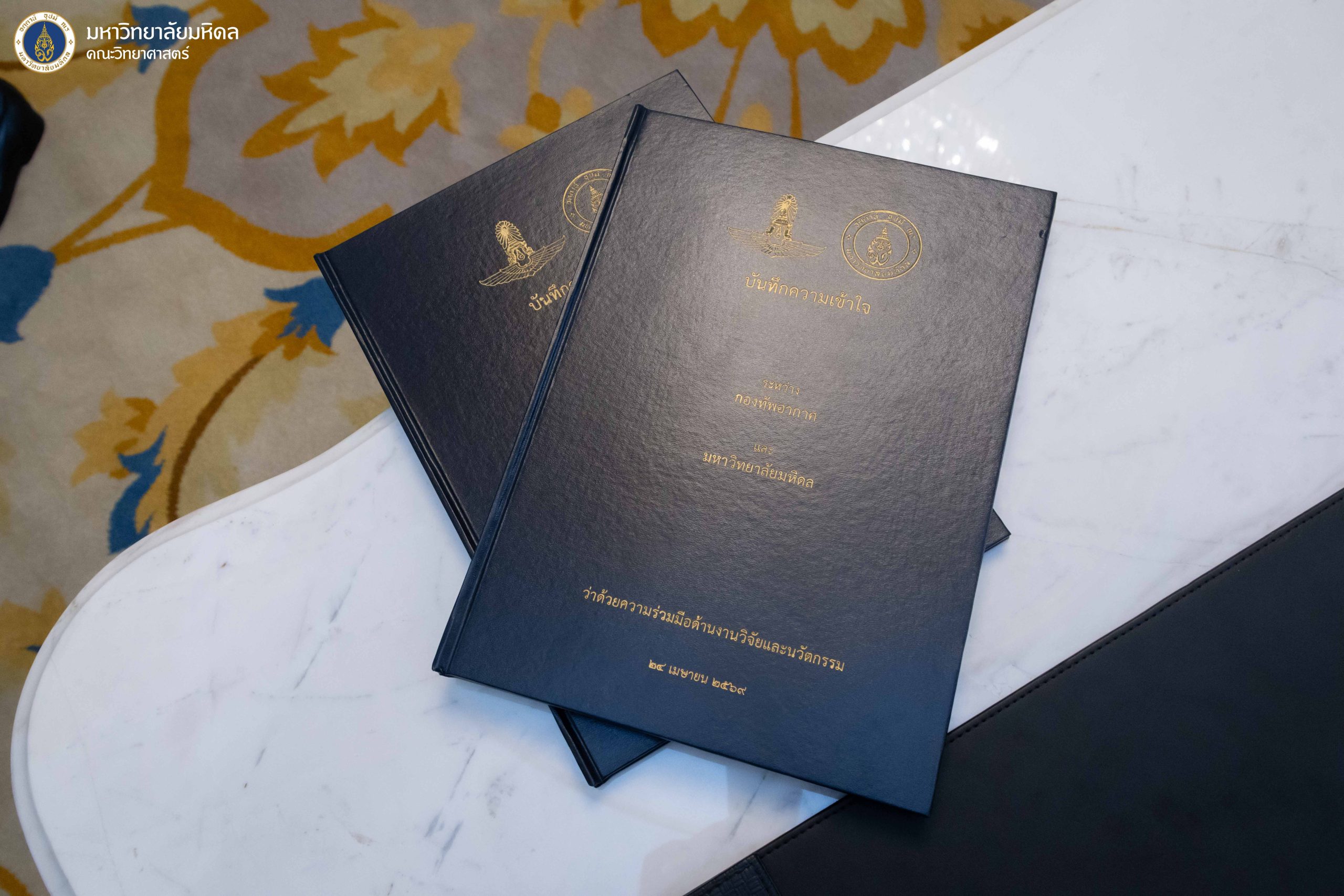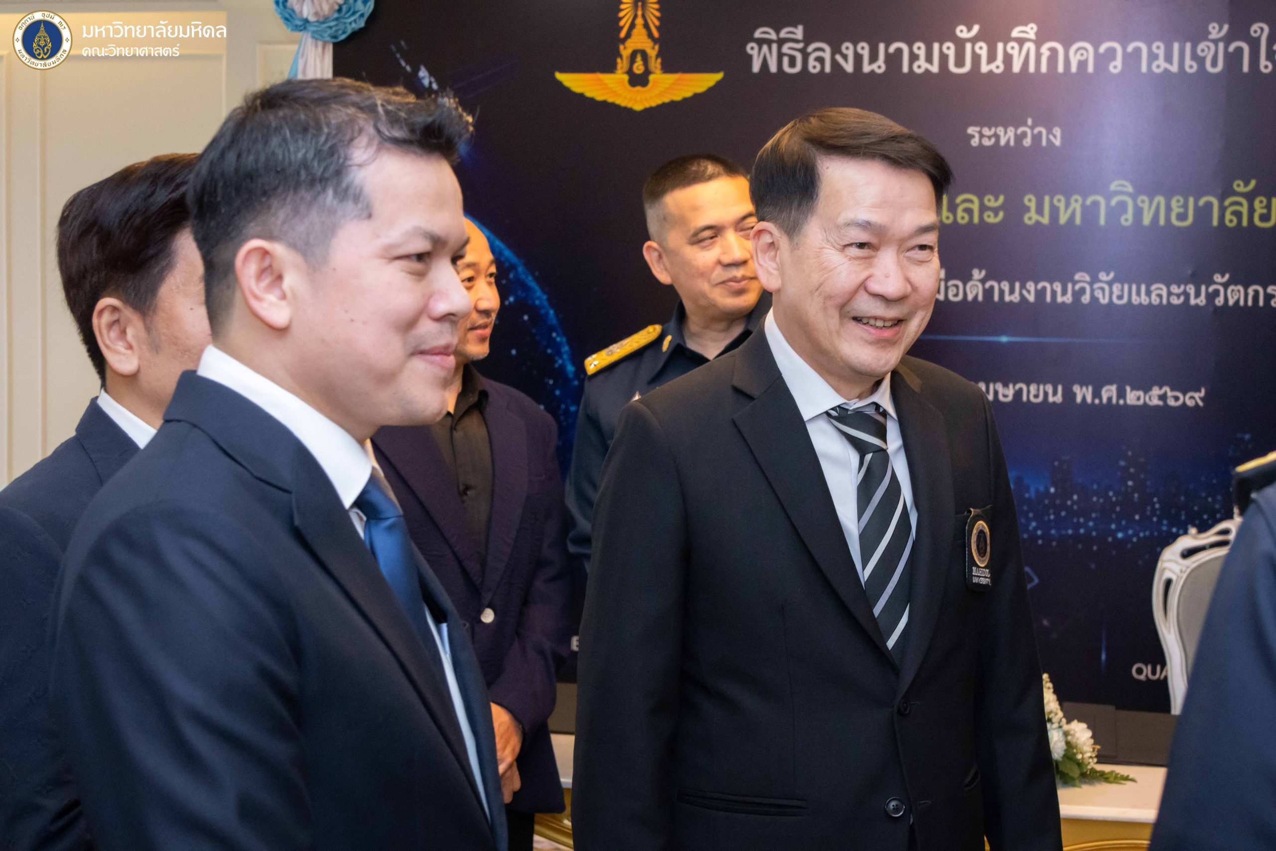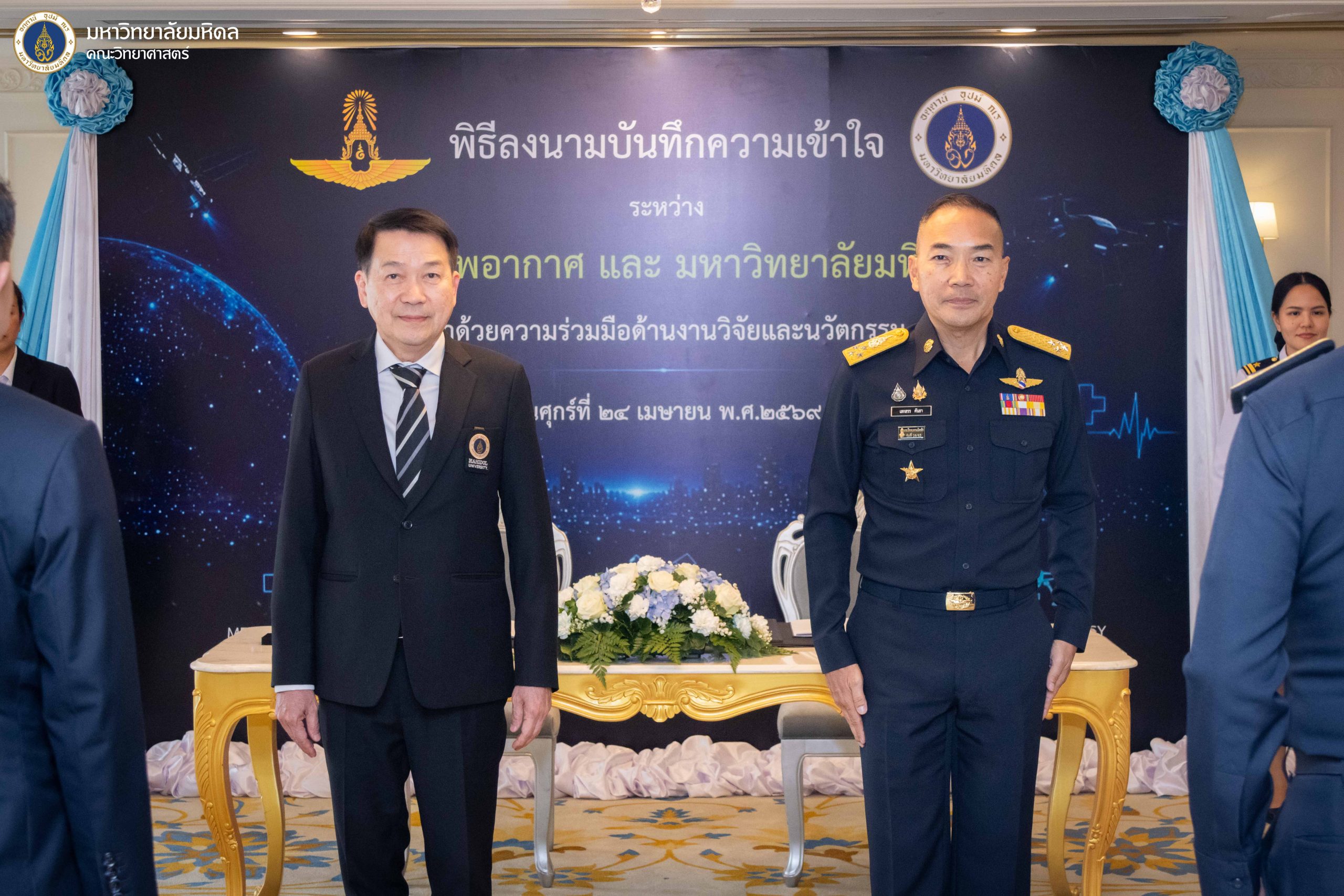 24 เมษายน 2569 มหาวิทยาลัยมหิดล พร้อมด้วย คณะวิทยาศาสตร์ คณะวิศวกรรมศาสตร์ และ คณะเทคโนโลยีสารสนเทศและการสื่อสาร ร่วมกับ กองทัพอากาศ ร่วมลงนามบันทึกข้อตกลงความร่วมมือด้านการวิจัยและนวัตกรรม ณ ห้องรับรองบริพัตร กองบัญชาการกองทัพอากาศ โดยมีวัตถุประสงค์เพื่อกำหนดกรอบความร่วมมือระหว่าง มหาวิทยาลัยมหิดล และ กองทัพอากาศ ในการพัฒนาองค์ความรู้ด้านการวิจัยและนวัตกรรมที่เกี่ยวข้องกับภารกิจด้านความมั่นคงและวิทยาศาสตร์ขั้นสูง รวมไปถึงการส่งเสริม สนับสนุน และประสานความร่วมมือเกี่ยวกับผลงานวิจัยและนวัตกรรมด้านเทคโนโลยีสารสนเทศ เทคโนโลยีป้องกันประเทศ เทคโนโลยีด้านอวกาศ และเทคโนโลยีอุบัติใหม่อื่น ๆ รวมทั้งขยายผลไปสู่การใช้งานในภารกิจของกองทัพอากาศด้านความมั่นคง การพัฒนาประเทศและช่วยเหลือประชาชน โดยมุ่งเน้นเทคโนโลยี 5 ด้านที่สำคัญ ได้แก่ Medical Science, Al/Software, Space, Quantum Physics และ Drone Technology ให้เกิดผลงานเชิงประจักษ์และต่อยอดได้จริง เพื่อนำไปสู่การบูรณาการศักยภาพและทรัพยากรของทั้งสองหน่วยงาน ไม่ว่าจะเป็นนักวิจัย ผู้เชี่ยวชาญ ห้องปฏิบัติการ ระบบข้อมูล และเทคโนโลยี เพื่อให้เกิดผลลัพธ์ทางวิชาการและเทคโนโลยีที่มีประสิทธิภาพสูงสุด ตลอดจนการพัฒนาบุคลากรและสร้างเครือข่ายนักวิจัยร่วม ผ่านการฝึกอบรม การแลกเปลี่ยนองค์ความรู้ การแลกเปลี่ยนบุคลากร การอบรมเฉพาะทาง และการดำเนินโครงการร่วมในระดับนักวิจัย นักศึกษาและผู้เชี่ยวชาญ