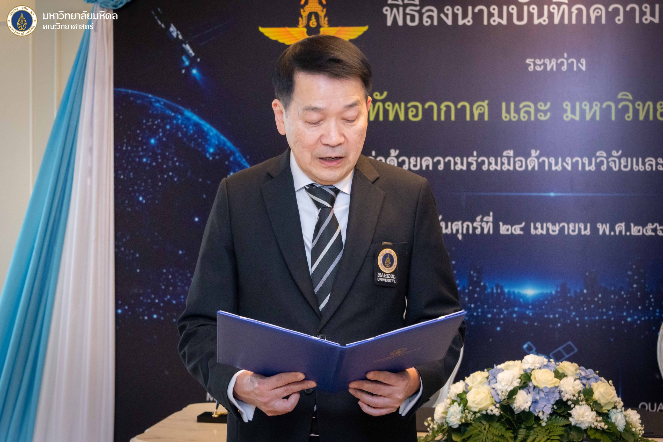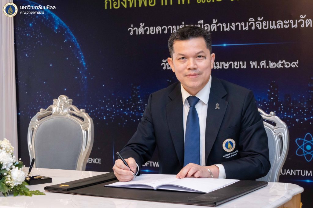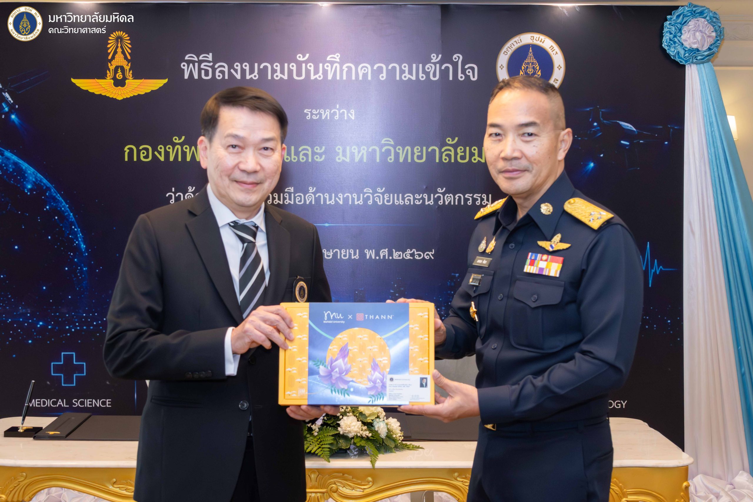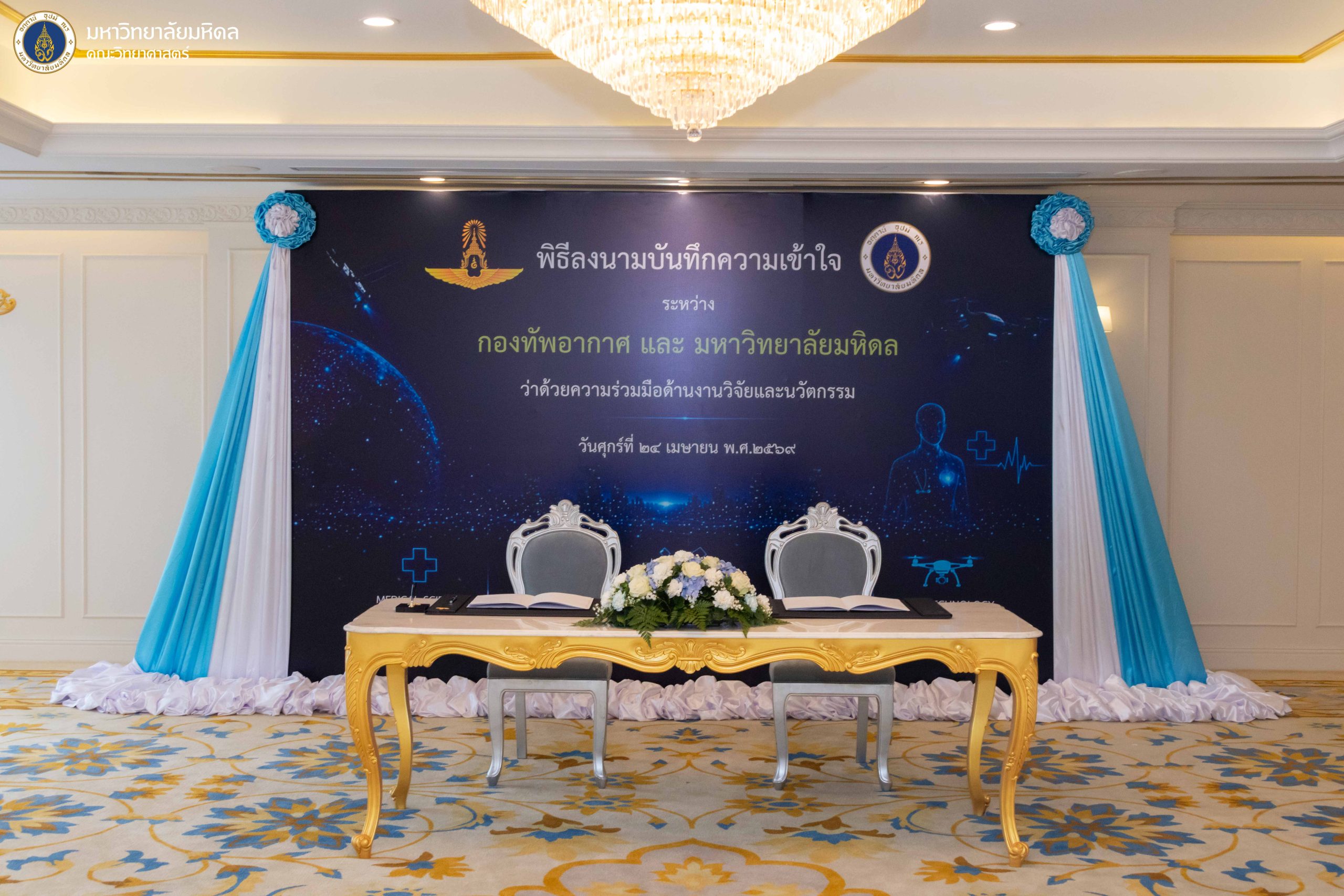 24 เมษายน 2569 มหาวิทยาลัยมหิดล พร้อมด้วย คณะวิทยาศาสตร์ คณะวิศวกรรมศาสตร์ และ คณะเทคโนโลยีสารสนเทศและการสื่อสาร ร่วมกับ กองทัพอากาศ ร่วมลงนามบันทึกข้อตกลงความร่วมมือด้านการวิจัยและนวัตกรรม ณ ห้องรับรองบริพัตร กองบัญชาการกองทัพอากาศ โดยมีวัตถุประสงค์เพื่อกำหนดกรอบความร่วมมือระหว่าง มหาวิทยาลัยมหิดล และ กองทัพอากาศ ในการพัฒนาองค์ความรู้ด้านการวิจัยและนวัตกรรมที่เกี่ยวข้องกับภารกิจด้านความมั่นคงและวิทยาศาสตร์ขั้นสูง รวมไปถึงการส่งเสริม สนับสนุน และประสานความร่วมมือเกี่ยวกับผลงานวิจัยและนวัตกรรมด้านเทคโนโลยีสารสนเทศ เทคโนโลยีป้องกันประเทศ เทคโนโลยีด้านอวกาศ และเทคโนโลยีอุบัติใหม่อื่น ๆ รวมทั้งขยายผลไปสู่การใช้งานในภารกิจของกองทัพอากาศด้านความมั่นคง การพัฒนาประเทศและช่วยเหลือประชาชน โดยมุ่งเน้นเทคโนโลยี 5 ด้านที่สำคัญ ได้แก่ Medical Science, Al/Software, Space, Quantum Physics และ Drone Technology ให้เกิดผลงานเชิงประจักษ์และต่อยอดได้จริง เพื่อนำไปสู่การบูรณาการศักยภาพและทรัพยากรของทั้งสองหน่วยงาน ไม่ว่าจะเป็นนักวิจัย ผู้เชี่ยวชาญ ห้องปฏิบัติการ ระบบข้อมูล และเทคโนโลยี เพื่อให้เกิดผลลัพธ์ทางวิชาการและเทคโนโลยีที่มีประสิทธิภาพสูงสุด ตลอดจนการพัฒนาบุคลากรและสร้างเครือข่ายนักวิจัยร่วม ผ่านการฝึกอบรม การแลกเปลี่ยนองค์ความรู้ การแลกเปลี่ยนบุคลากร การอบรมเฉพาะทาง และการดำเนินโครงการร่วมในระดับนักวิจัย นักศึกษาและผู้เชี่ยวชาญ