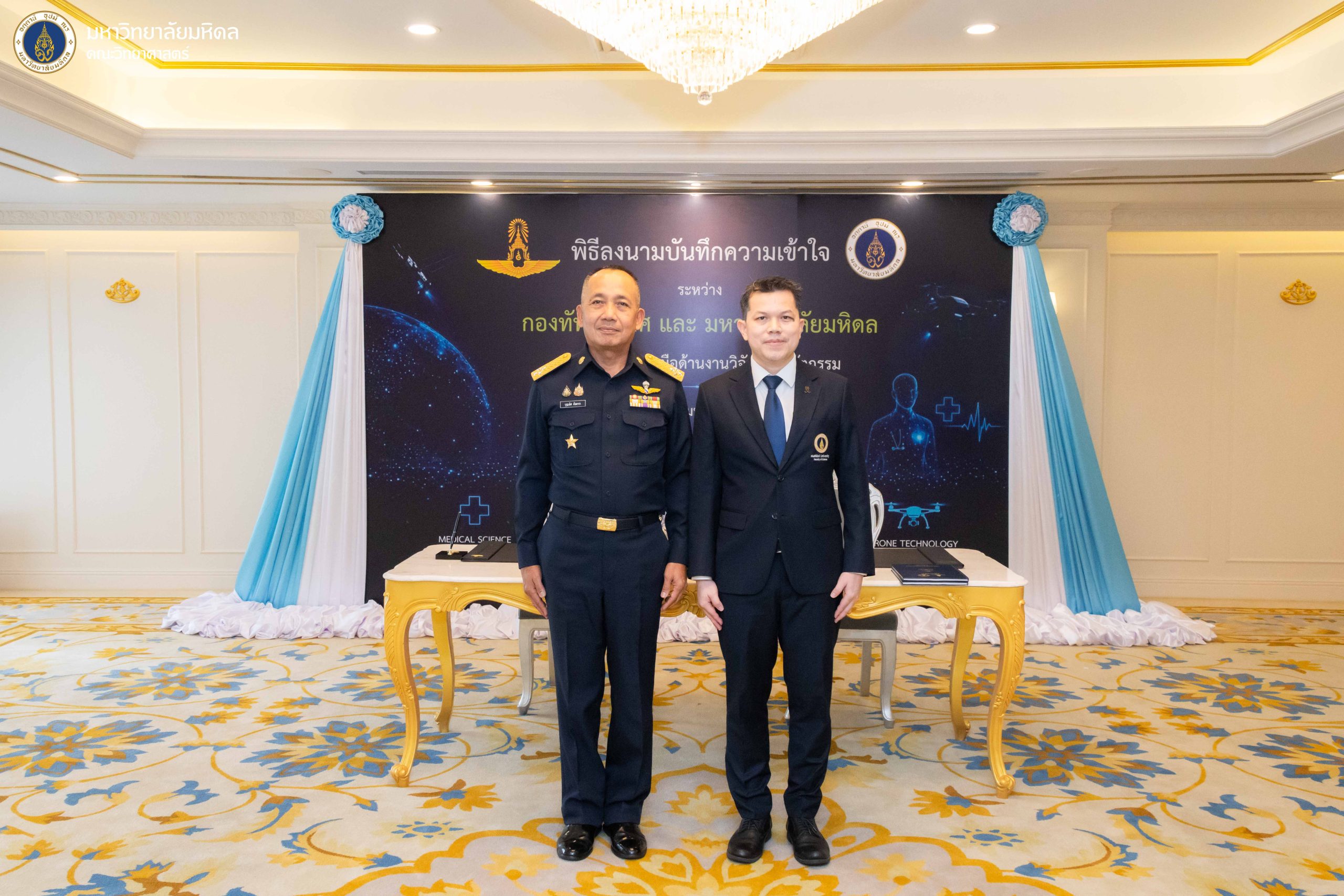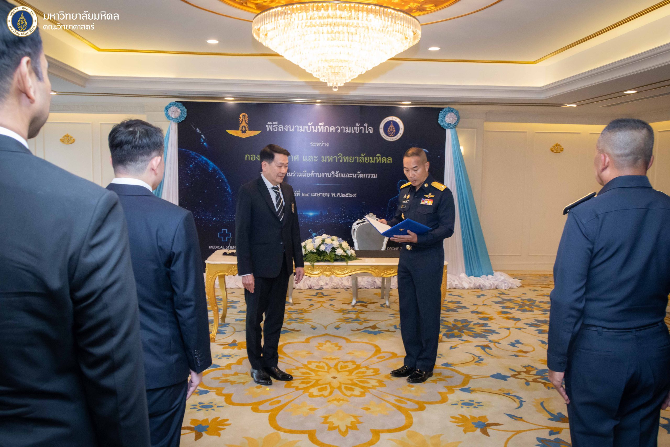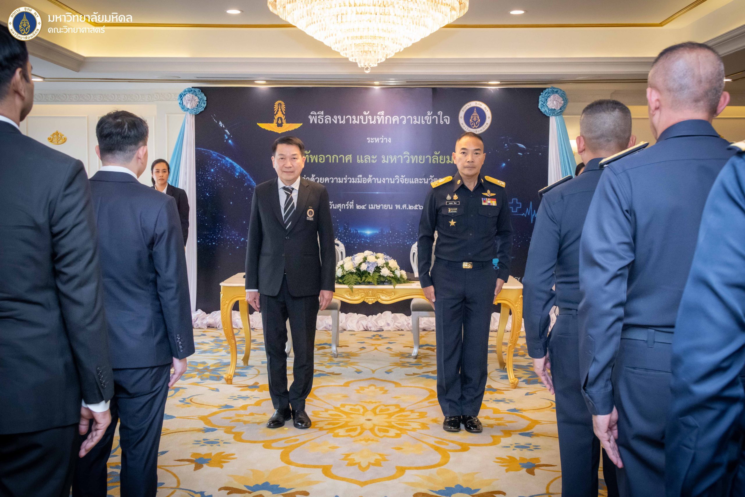 โดยพิธีลงนามบันทึกข้อตกลงความร่วมมือในครั้งนี้ ในนามของ มหาวิทยาลัยมหิดล ได้นำโดย ศาสตราจารย์ นายแพทย์ปิยะมิตร ศรีธรา อธิการบดีมหาวิทยาลัยมหิดล ได้เข้าร่วมเป็นเกียรติพร้อมร่วมลงนามบันทึกข้อตกลงความร่วมมือด้านการวิจัยและนวัตกรรม ร่วมกับ กองทัพอากาศ ซึ่งนำโดย พลอากาศเอก เสกสรร คันธา ผู้บัญชาการทหารอากาศ และ พลอากาศเอก บุญเลิศ อันดารา ที่ปรึกษาพิเศษกองทัพอากาศ โดยมี รองศาสตราจารย์ ดร.ประสิทธิ์ สุวรรณเลิศ คณบดีคณะวิทยาศาสตร์ มหาวิทยาลัยมหิดล, รองศาสตราจารย์ ดร.ธนภัทร์ วานิชานนท์ คณบดีคณะวิศวกรรมศาสตร์ มหาวิทยาลัยมหิดล และ อาจารย์ ดร.พัฒนศักดิ์ มงคลวัฒน์ คณบดีคณะเทคโนโลยีสารสนเทศและการสื่อสาร มหาวิทยาลัยมหิดล ให้เกียรติร่วมลงนามเป็นสักขีพยานในพิธีลงนามบันทึกข้อตกลงในครั้งนี้ โดยมีคณะผู้แทนจากหน่วยงานภายใต้กองทัพอากาศ และคณะผู้บริหาร คณาจารย์ จากมหาวิทยาลัยมหิดล เข้าร่วมเป็นเกียรติกันอย่างคับคั่ง
