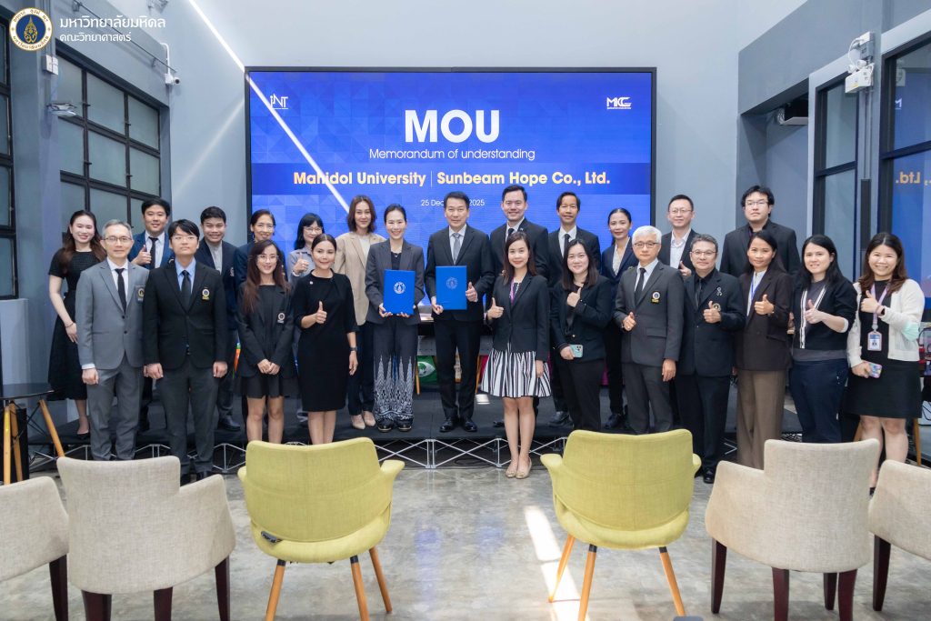25 ธันวาคม 2568 คณะวิทยาศาสตร์ ร่วมเป็นเกียรติในพิธีลงนามบันทึกความเข้าใจร่วมกันระหว่าง มหาวิทยาลัยมหิดลกับบริษัท ซันบีมโฮป จำกัด ซึ่งจัดขึ้นโดยสถาบันบริหารจัดการเทคโนโลยีและนวัตกรรม ณ MaShares Co-Working Space @MB มหาวิทยาลัยมหิดล ศาลายา      ในพิธีลงนามได้รับเกียรติจาก ศาสตราจารย์ นายแพทย์ปิยะมิตร ศรีธรา อธิการบดีมหาวิทยาลัยมหิดล กล่าวถึงความร่วมมือและเจตนารมณ์ของการลงนามบันทึกความเข้าใจครั้งนี้ ต่อด้วยคุณชนาพรรณ จึงรุ่งเรืองกิจ กรรมการบริษัท บริษัท ซันบีมโฮป จำกัด กล่าวถึงวัตถุประสงค์ เพื่อส่งเสริมและพัฒนางานวิจัยและนวัตกรรมร่วมกันทางด้านการศึกษาและเทคโนโลยี สำหรับเด็กที่มีความต้องการจำเป็นพิเศษ (Special Educational Needs: SEN) ครอบคลุมสหสาขาวิชา เพื่อยกระดับคุณภาพชีวิตและผลลัพธ์การเรียนรู้ของผู้เรียนอย่างยั่งยืน โดยมีขอบเขตความร่วมมือในด้านการสนับสนุนการจัดการศึกษาและการพัฒนาหลักสูตรร่วม (co-curriculum/co-teaching) การพัฒนาพื้นที่ต้นแบบ “โรงเรียนสำหรับเด็กพิเศษ” การสนับสนุนการนำผลงานวิจัยสู่การใช้ประโยชน์ รวมถึงความร่วมมืออื่น ๆ ในอนาคตอย่างยั่งยืน       ในพิธีลงนามความร่วมมือได้รับเกียรติจาก ศาสตราจารย์ นายแพทย์ปิยะมิตร ศรีธรา อธิการบดีมหาวิทยาลัยมหิดล รองศาสตราจารย์ ดร.วิริยะ เตชะรุ่งโรจน์ ผู้อำนวยการสถาบันบริหารจัดการเทคโนโลยีและนวัตกรรม คุณชนาพรรณ จึงรุ่งเรืองกิจ กรรมการบริษัท บริษัท
