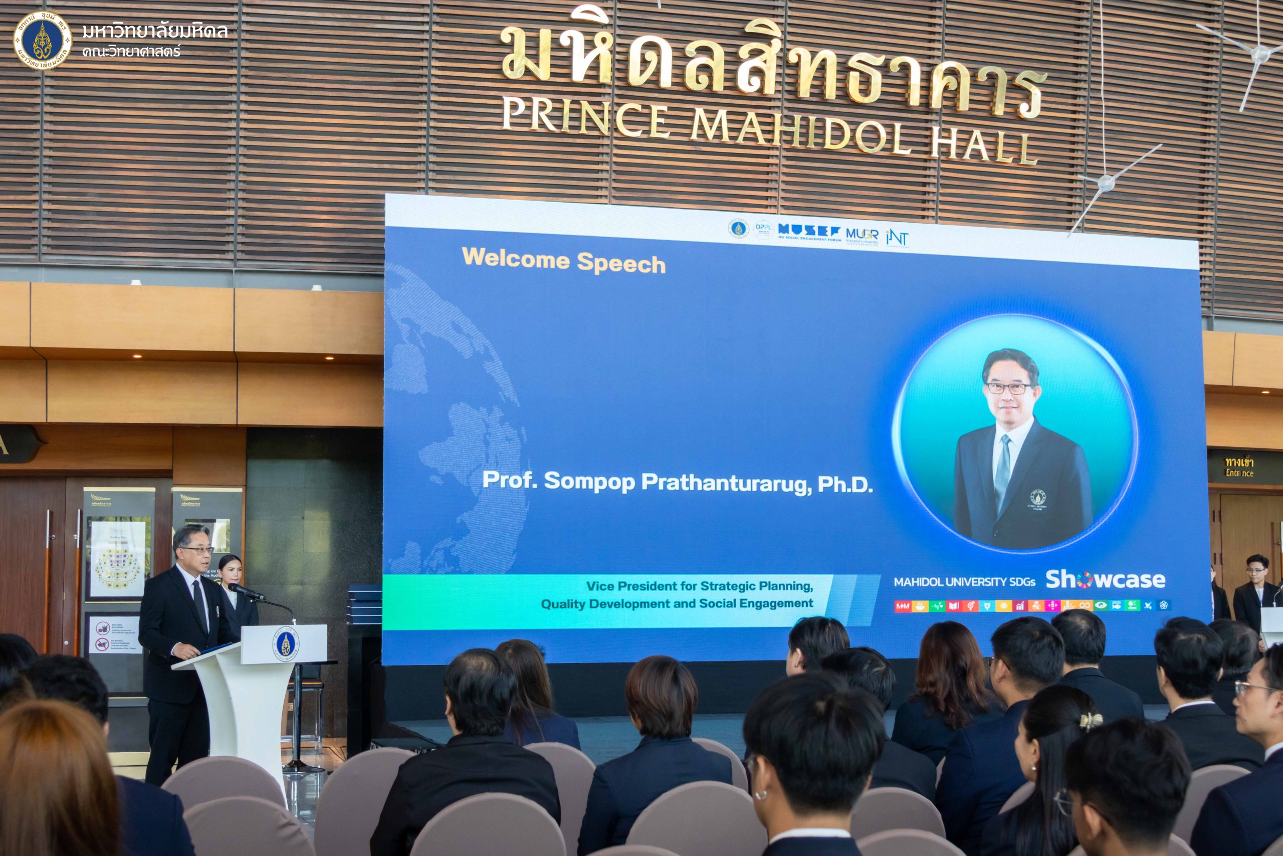 โดยในพิธีเปิดได้รับเกียรติจาก ศาสตราจารย์คลินิกเกียรติคุณ นพ.ปิยะสกล สกลสัตยาทร นายกสภามหาวิทยาลัยมหิดล กล่าวเปิดงาน และ ศาสตราจารย์ นพ.ปิยะมิตร ศรีธรา อธิการบดีมหาวิทยาลัยมหิดล บรรยายพิเศษในหัวข้อ “SDGs for Real World Impact: From Campus to Community“ พร้อมทั้งมอบรางวัลแก่ผู้ได้รางวัลประเภทต่าง ๆ โดยมี ศาสตราจารย์ ดร. เภสัชกรสมภพ ประธานธุรารักษ์ รองอธิการบดีฝ่ายแผนกลยุทธ์ พัฒนาคุณภาพและพันธกิจเพื่อสังคม มหาวิทยาลัยมหิดล กล่าวรายงานวัตถุประสงค์และความสำคัญของการจัดงาน ซึ่งมุ่งเชื่อมโยงนโยบายระดับมหาวิทยาลัยกับการลงมือทำจริงของคณาจารย์ บุคลากร และนักศึกษา