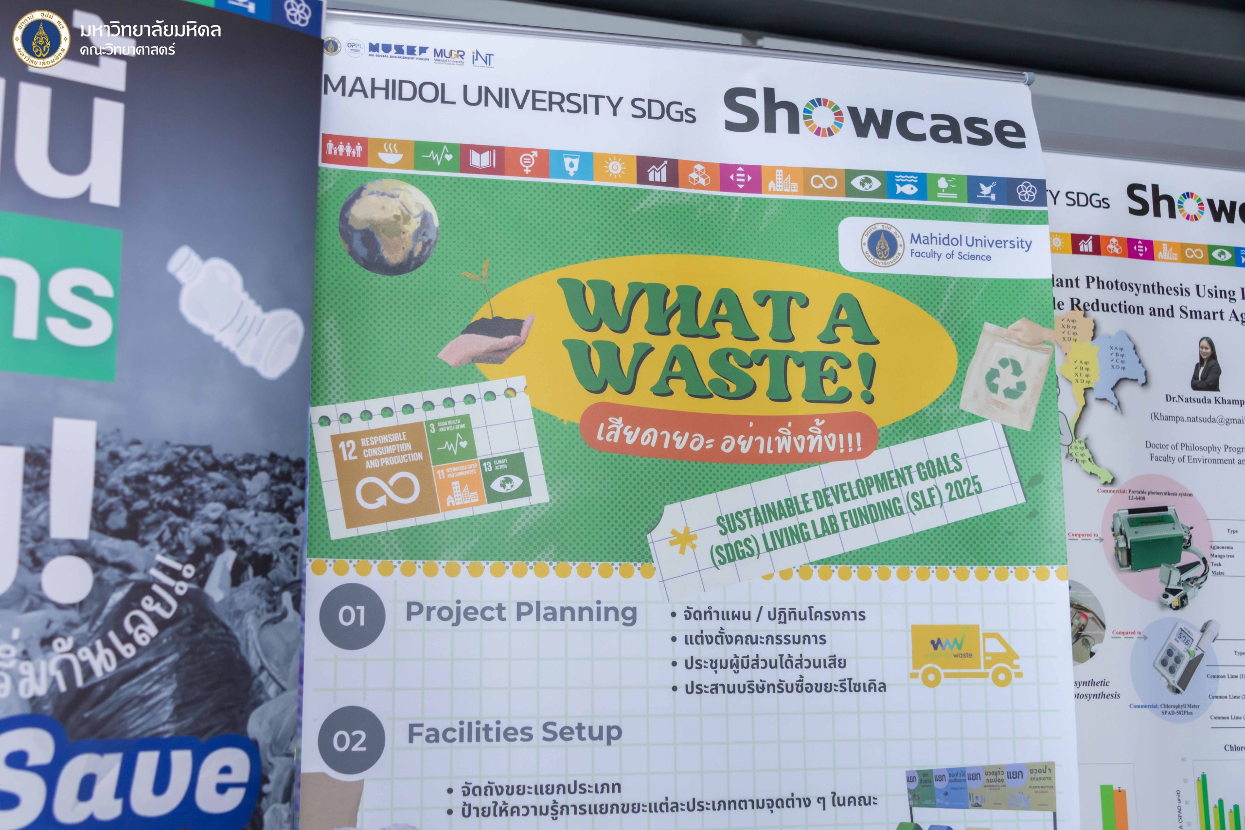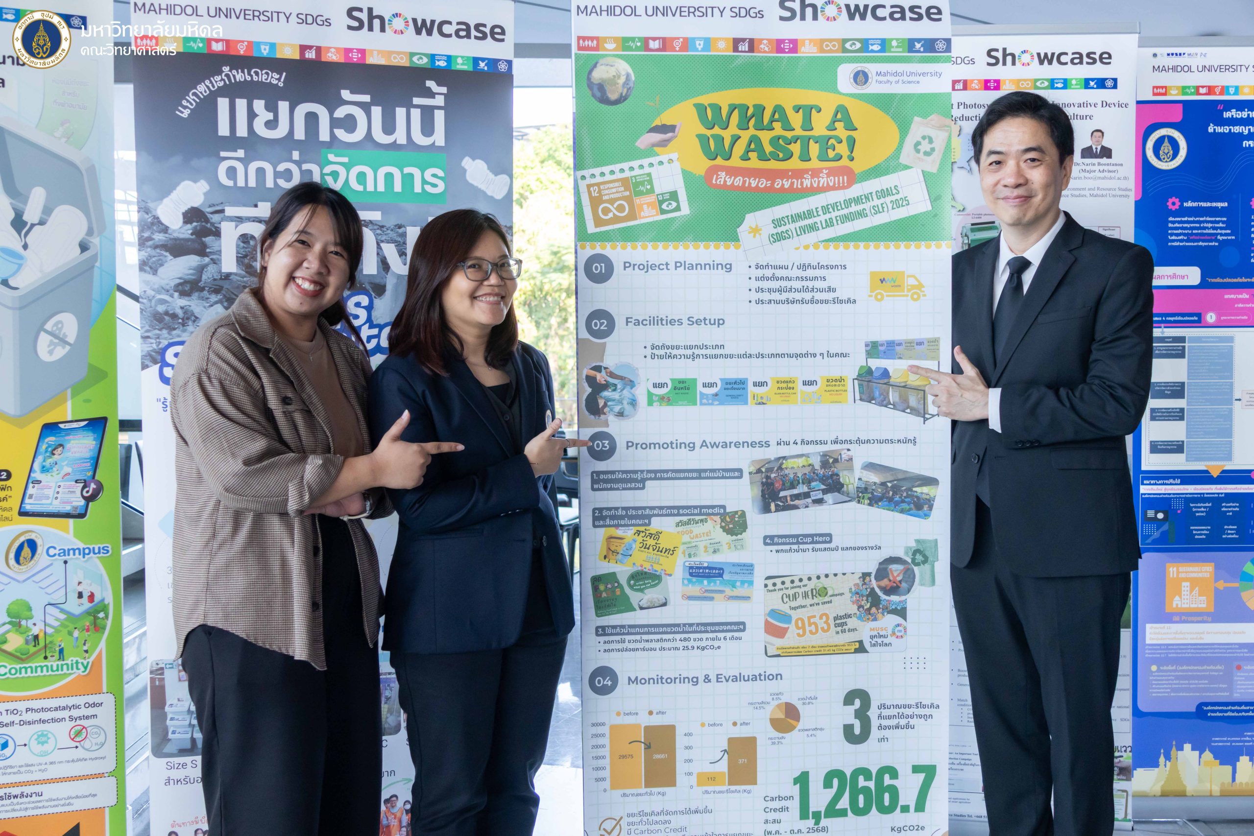 ในโอกาสนี้ คณะวิทยาศาสตร์ มหาวิทยาลัยมหิดล ได้ร่วมเป็นเกียรติในงานและรับรางวัล SDGs Living Lab Funding Awardee จากโครงการ “เสียดายอ่ะ อย่าพึ่งทิ้ง” ซึ่งเป็นการริ่เริ่มโครงการด้านความยั่งยืนและผลักดันงานด้าน SDGs ในคณะวิทยาศาสตร์อย่างเป็นรูปธรรม โดย ศาสตราจารย์ ดร.วิฑูร แสงศิริสุวรรณ รองคณบดีคณะวิทยาศาสตร์ ได้เข้ารับรางวัลจากศาสตราจารย์คลินิกเกียรติคุณ นพ.ปิยะสกล สกลสัตยาทร นายกสภามหาวิทยาลัยมหิดล โดยมี ผู้ช่วยศาสตราจารย์ ดร.นิสา ปฏิการมณฑล ผู้ช่วยคณบดีฝ่ายแผนงบประมาณและความยั่งยืน และนางสาวปวีณ์สุดา สุขสมชิต บุคลากรงานแผนและพัฒนาคุณภาพ ผู้ดำเนินโครงการ “เสียดายอ่ะ อย่าพึ่งทิ้ง” ร่วมนำเสนอผลงานในครั้งนี้ด้วย