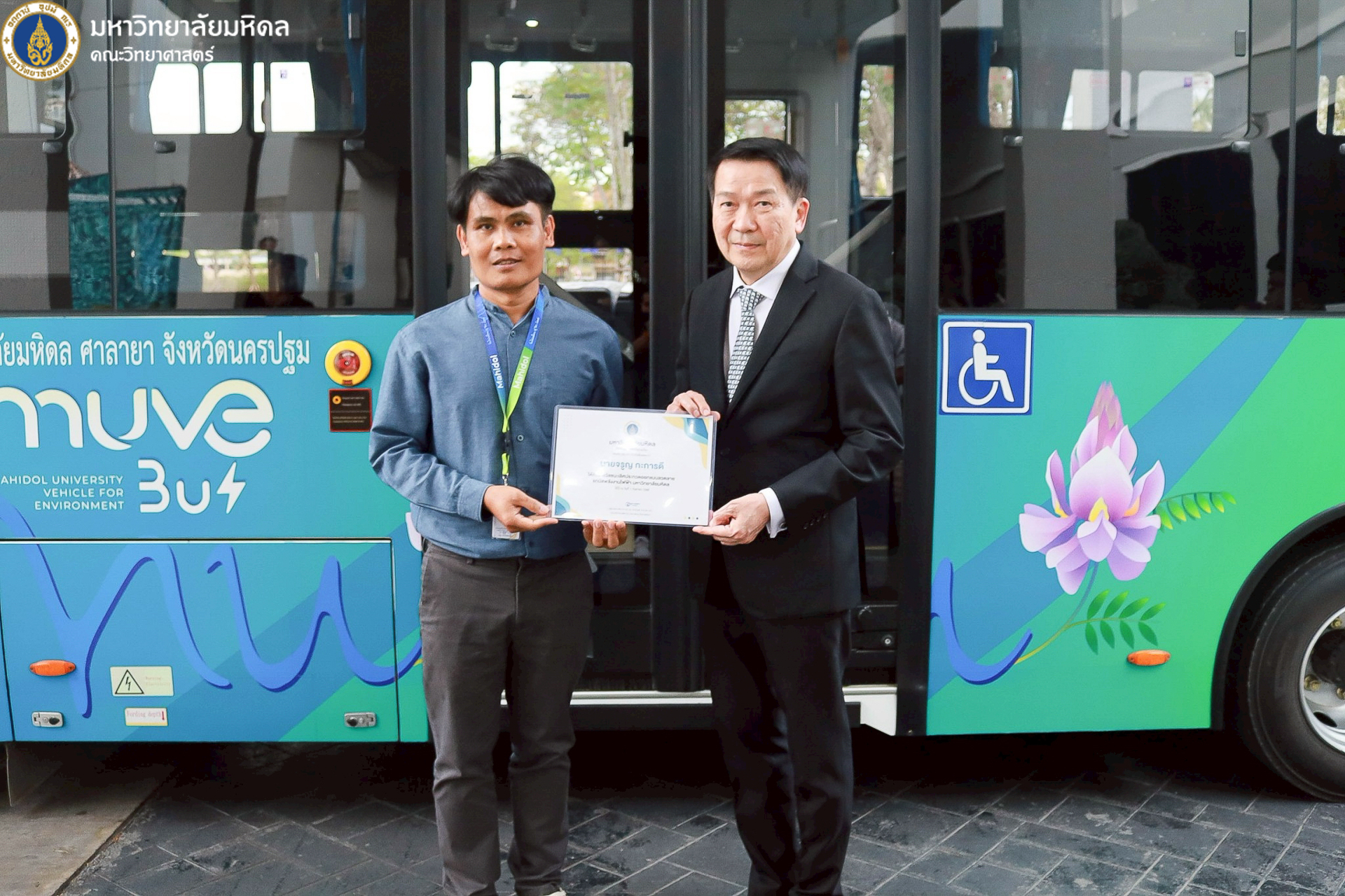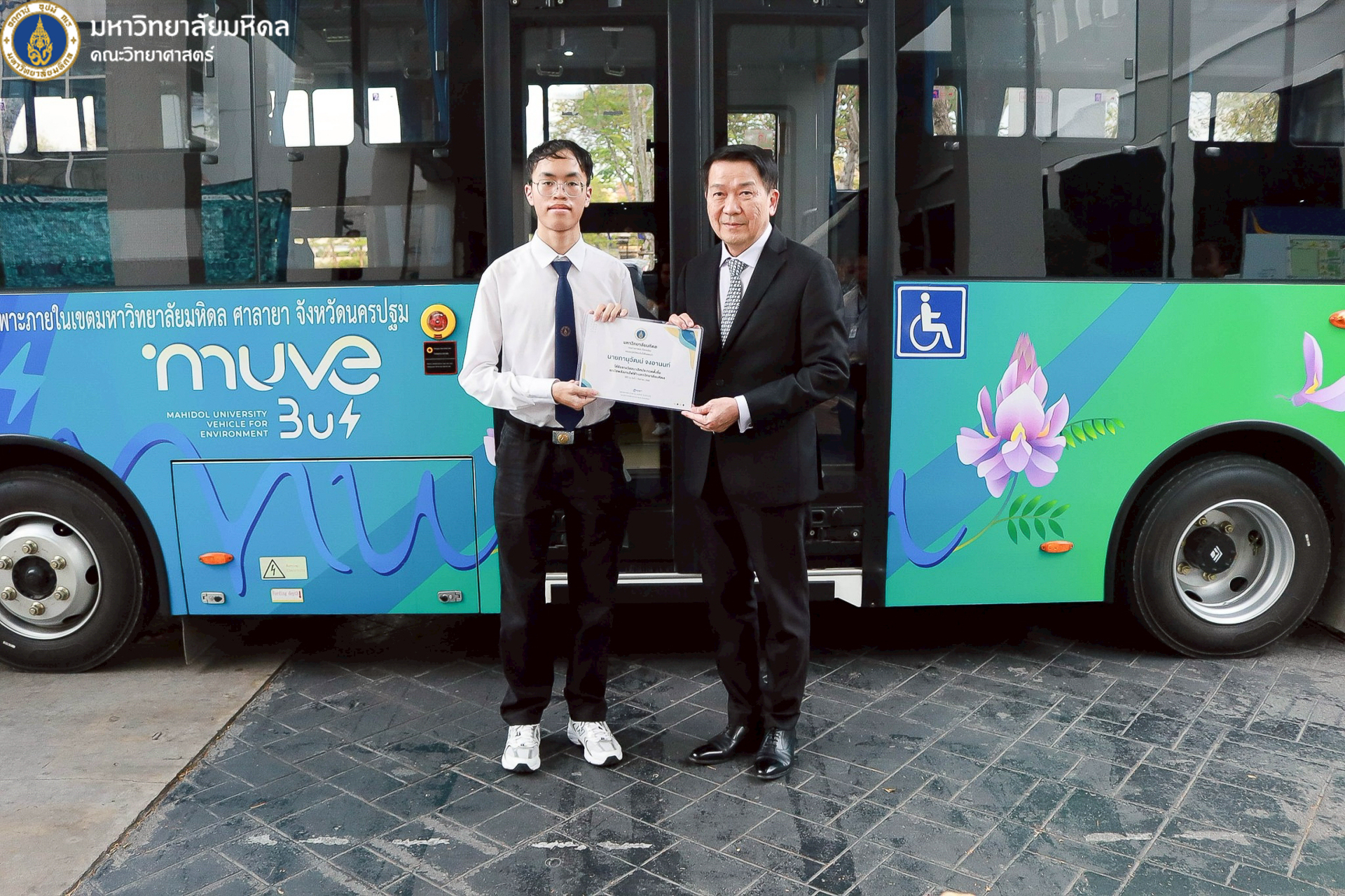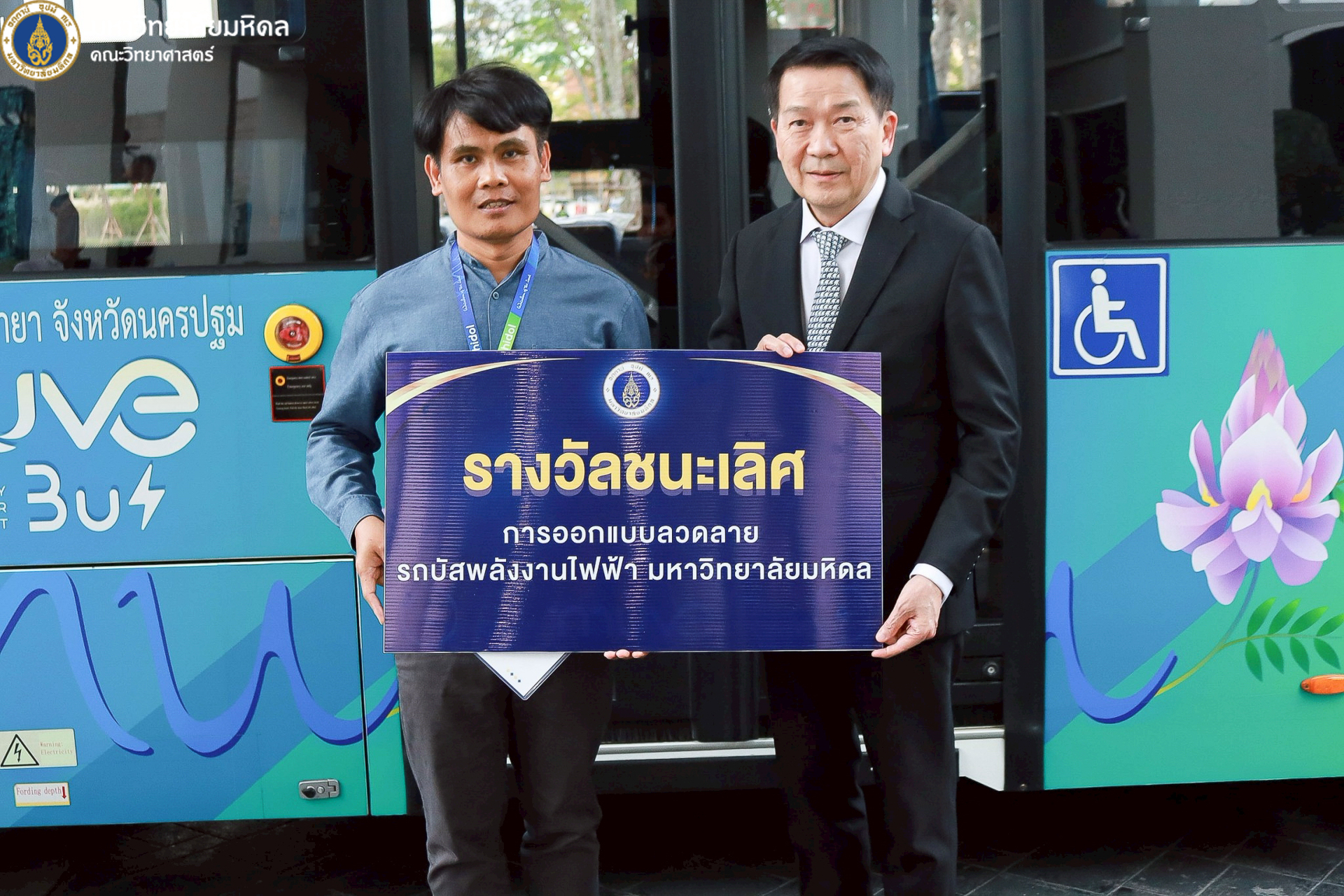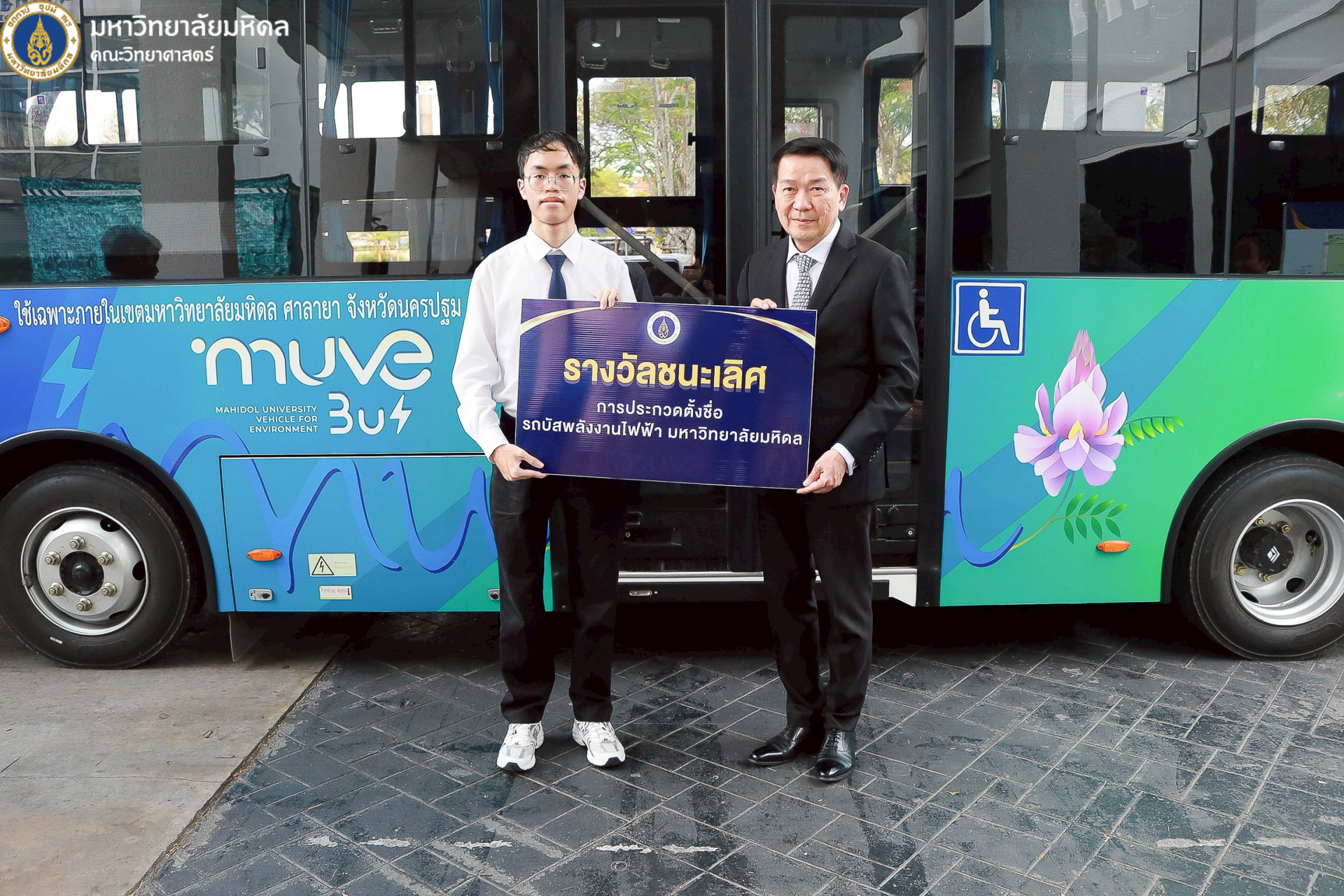 22 ธันวาคม 2568 มหาวิทยาลัยมหิดล นำโดย ศาสตราจารย์ นพ. ปิยะมิตร ศรีธรา อธิการบดี พร้อมด้วยทีมผู้บริหารมหาวิทยาลัย ผู้บริหารส่วนงาน รวมถึงคณะวิทยาศาสตร์ นำโดย คุณปิยะ โพธิ์สิทธิ์ หัวหน้างานศาลายา และรักษาการงานนวัตกรรมการศึกษาและหลักสูตรนานาชาติ เป็นผู้แทนคณบดี ร่วมพิธีเปิดและมอบรางวัลโครงการประกวดตั้งชื่อและออกแบบลวดลายรถบัสพลังงานไฟฟ้า ที่ให้บริการภายในวิทยาเขตศาลายา ซึ่งจัดขึ้นโดยกองกายภาพและสิ่งแวดล้อม เพื่อส่งเสริมให้ประชาคมชาวมหาวิทยาลัยมหิดลทั้งนักศึกษาและบุคลากร เกิดความรู้จัก คุ้นเคย และมีส่วนร่วมกับการใช้บริการรถบัสพลังงานไฟฟ้า รวมถึงสร้างภาพลักษณ์ที่ดีและเป็นเอกลักษณ์ให้แก่รถบัสพลังงานไฟฟ้าภายในมหาวิทยาลัย ณ บริเวณด้านหน้าอาคารสำนักงานอธิการบดี มหาวิทยาลัยมหิดล ศาลายา