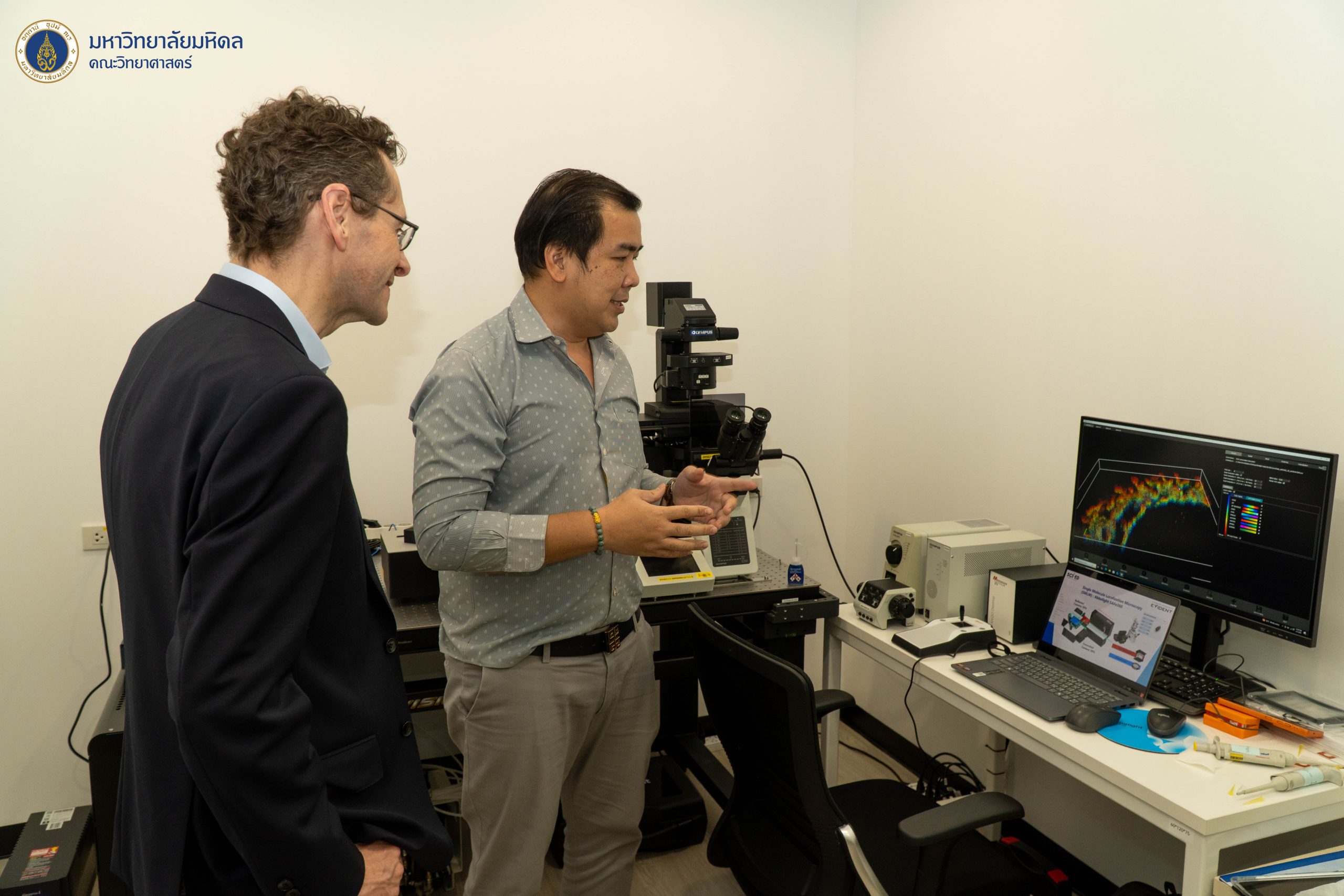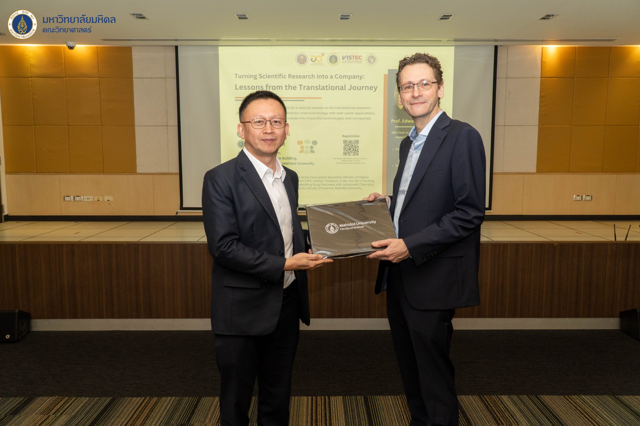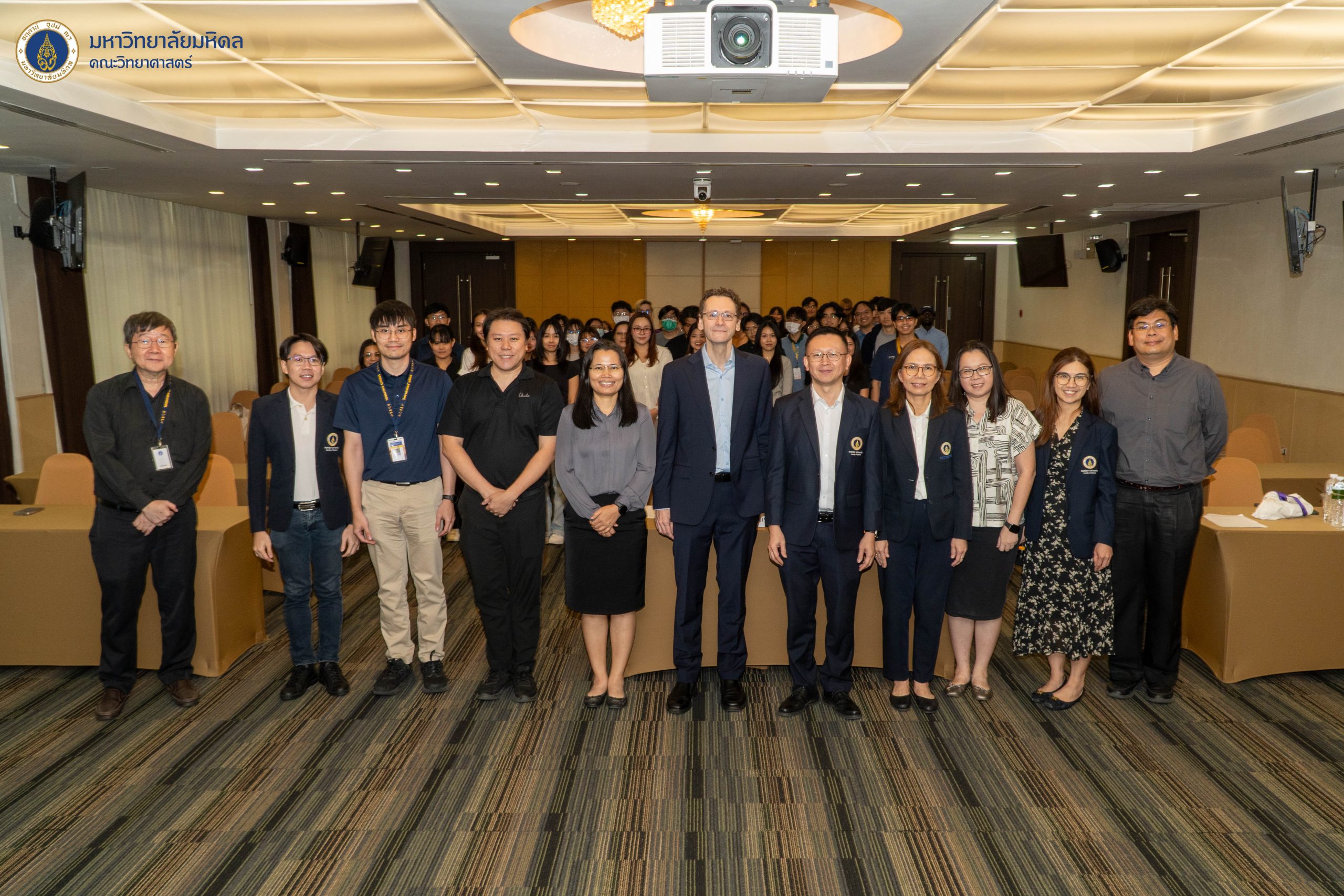 โดยภายในงานได้รับเกียรติจาก รองศาสตราจารย์ ดร.พสิษฐ์ ภควัชร์ภาณุรัตน์ รองคณบดีฝ่ายวิจัยและนวัตกรรม มาร่วมเป็นประธานกล่าวเปิดงาน พร้อมด้วย Prof. Edward W. Tate : GSK Chair in Chemical Biology, Imperial College London United Kingdom ที่มาร่วมเป็นวิทยากร โดยมี รองศาสตราจารย์ ดร.ปฐมพล วงศ์ตระกูลเกตุ ผู้ช่วยคณบดีฝ่ายวิจัยและนวัตกรรม เป็นผู้ดำเนินรายการ อีกทั้งยังได้มีการร่วมเยี่ยมชมและศึกษาดูงานศูนย์วิจัย Mahidol–Evident Bioimaging Center (EBC) ซึ่งเป็นศูนย์เครื่องมือและโครงสร้างพื้นฐานวิจัยที่สำคัญของคณะวิทยาศาสตร์ อันแสดงให้เห็นถึงศักยภาพด้านวิทยาศาสตร์พื้นฐานที่สนับสนุนงานวิจัยทางการแพทย์และสุขภาพในระดับสากล