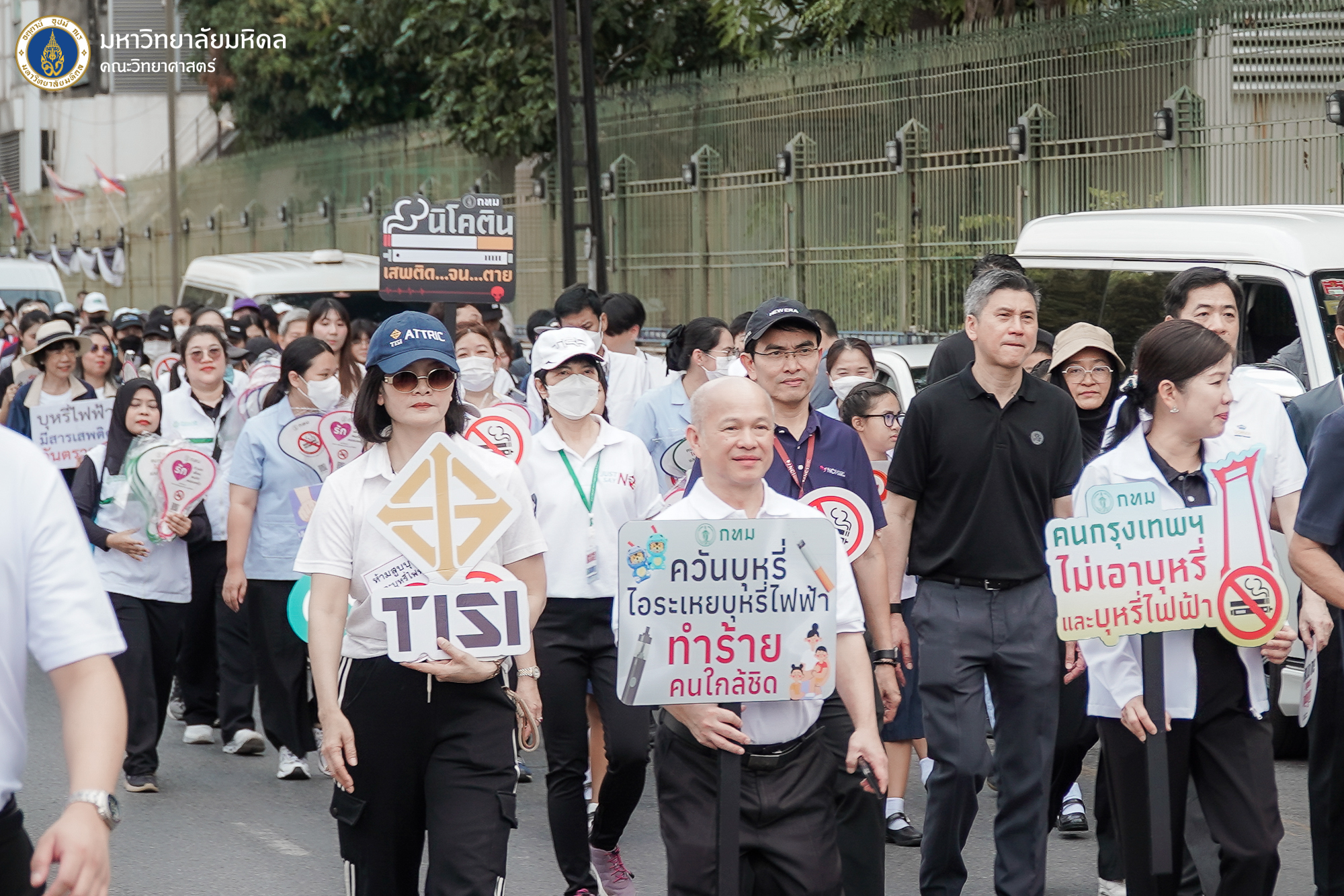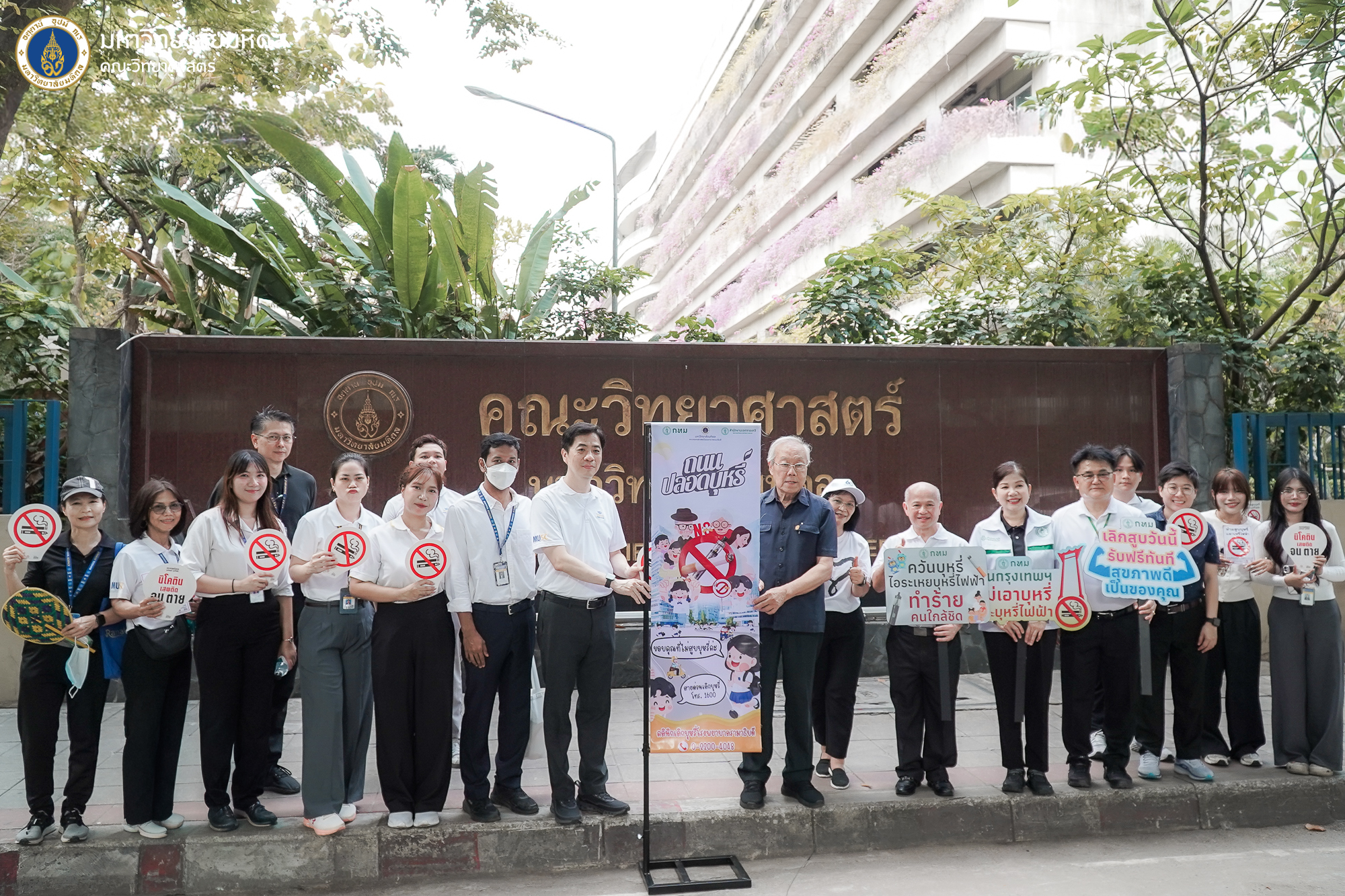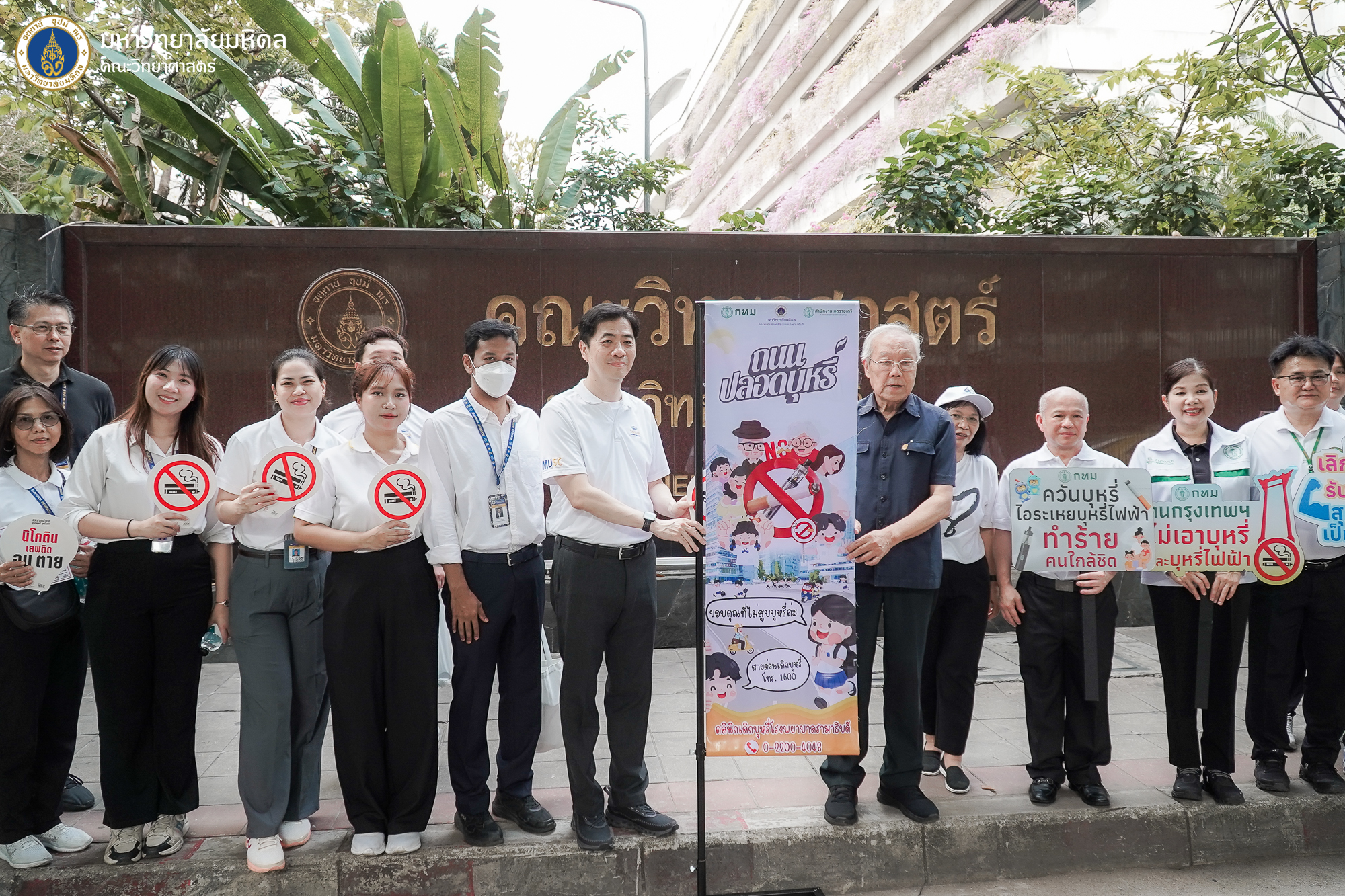 ในการนี้ คณะวิทยาศาสตร์ มหาวิทยาลัยมหิดล นำโดย ศาสตราจารย์ ดร.วิฑูร แสงศิริสุวรรณ รองคณบดี และ นายคณภรณ์ เข็มทอง หัวหน้างานบริหารและธุรการ พร้อมด้วยบุคลากรภายในสำนักงานคณบดีและภาควิชาของคณะฯ ได้เข้าร่วมเป็นเกียรติรับมอบธงรณรงค์ปลอดบุหรี่ พร้อมร่วมเดินรณรงค์และปักหมุดสัญลักษณ์ตลอดแนวเส้นทาง เพื่อส่งเสริมการมีส่วนร่วมของหน่วยงาน ภาคีเครือข่าย และประชาชนในการสร้างความตระหนักรู้ถึงพิษภัยของควันบุหรี่และบุหรี่ไฟฟ้า เพื่อสนับสนุนให้ถนนพระรามที่ 6 เป็นต้นแบบ “ถนนปลอดบุหรี่” ภายใต้แนวคิดการสร้างสังคมอากาศบริสุทธิ์และสิ่งแวดล้อมที่ปลอดภัยสำหรับประชาชน ผู้ป่วย และผู้สัญจร ลดการได้รับควันบุหรี่มือสองในพื้นที่ทางเดินเท้าและจุดรอรถโดยสารสาธารณะที่มีประชาชนสัญจรจำนวนมาก เพื่อร่วมขับเคลื่อนสังคมสุขภาวะที่ดี และยกระดับคุณภาพชีวิตควบคู่สิ่งแวดล้อมเมืองอย่างยั่งยืน