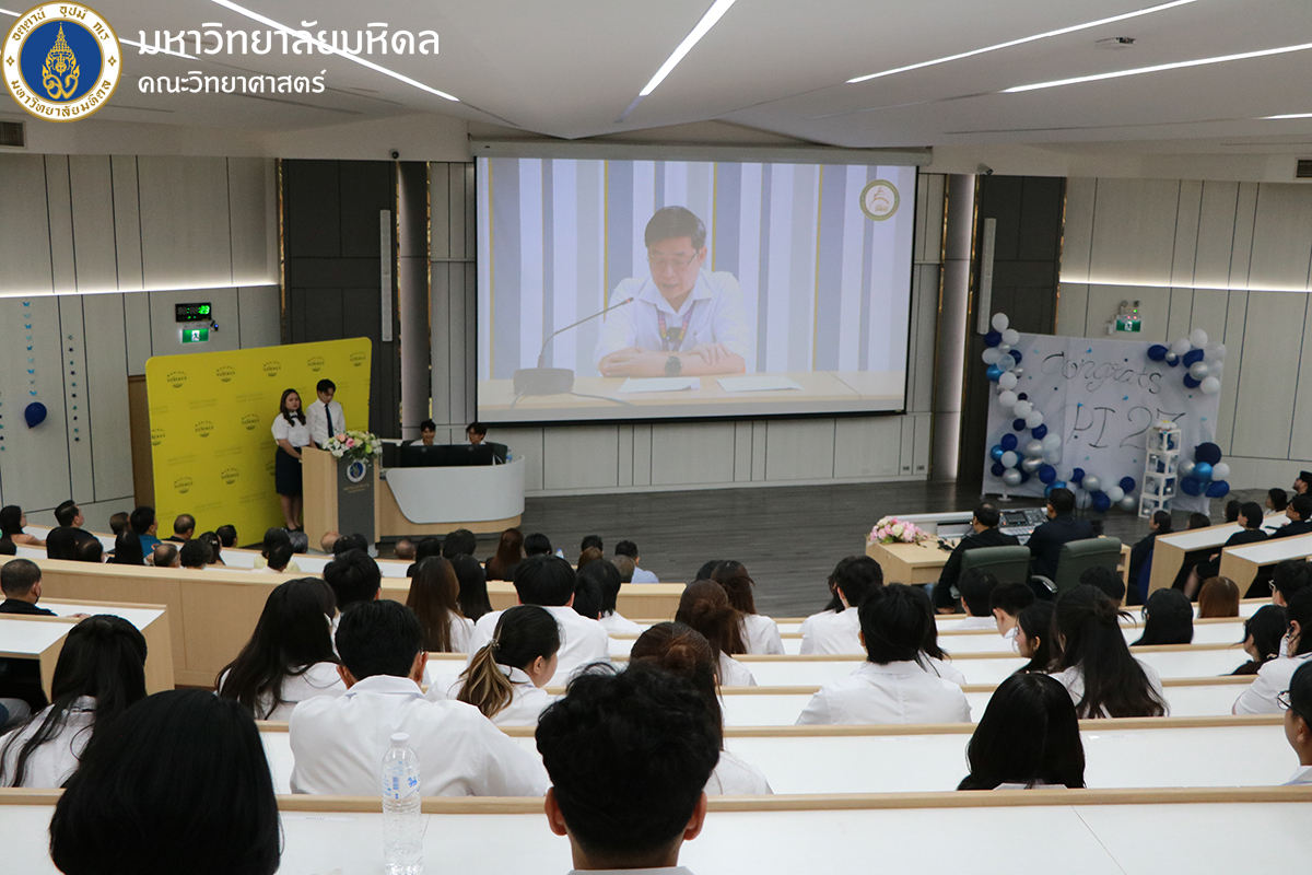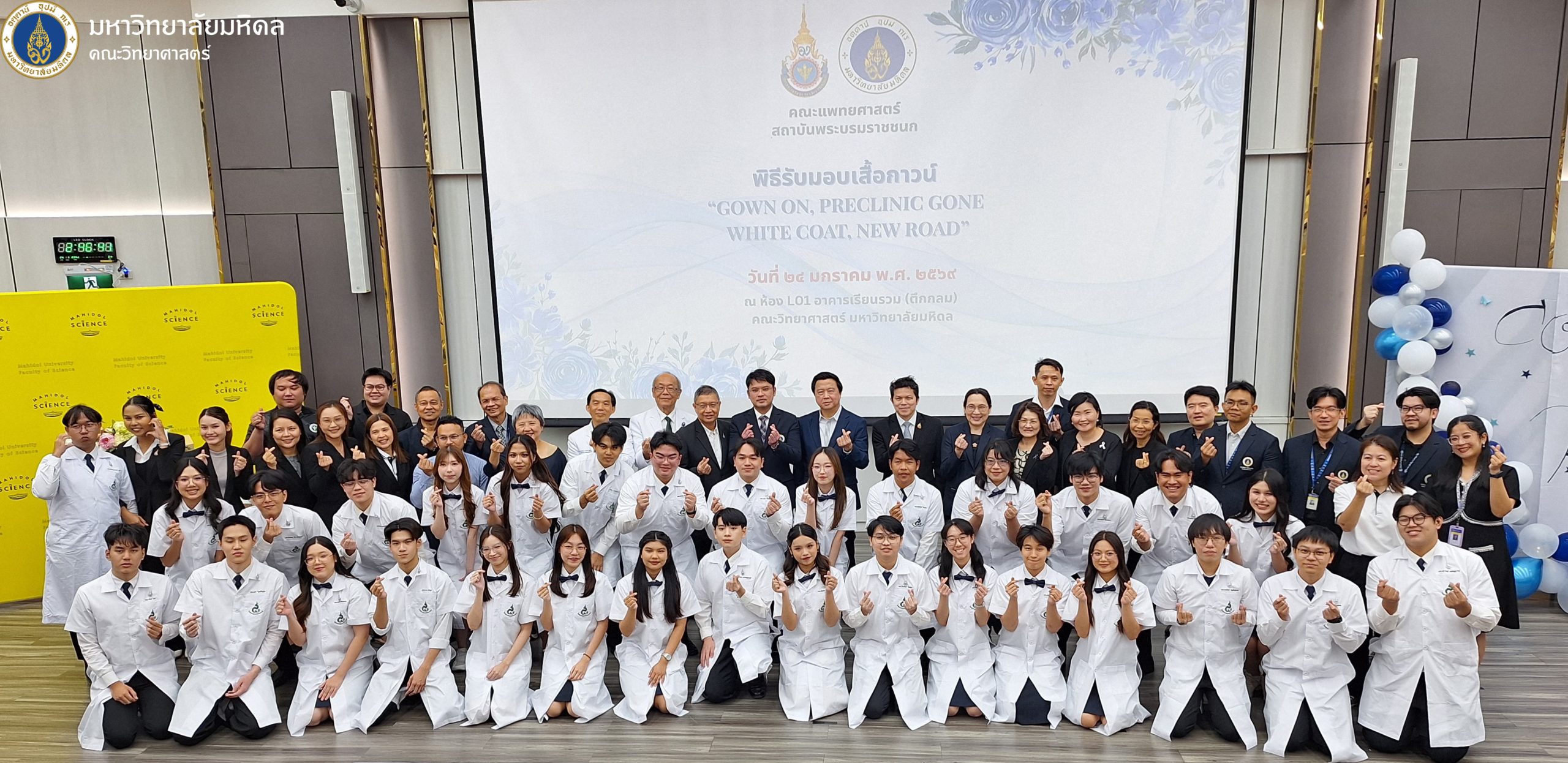 คณะวิทยาศาสตร์ มหาวิทยาลัยมหิดล จัดงานปัจฉิมนิเทศและพิธีมอบเสื้อกาวน์ให้แก่นักศึกษาแพทย์ชั้นพรีคลินิกปีที่ 3 ประจำปีการศึกษา 2568 ภายใต้แนวคิด “Gown On, Preclinic Gone White Coat, New Road” เมื่อวันเสาร์ที่ 24 มกราคม 2569 ณ ห้องบรรยาย L01 เพื่อเป็นการเตรียมความพร้อมและสร้างขวัญกำลังใจแก่นักศึกษาก่อนก้าวเข้าสู่การเรียนในระดับชั้นคลินิกอย่างเต็มตัว