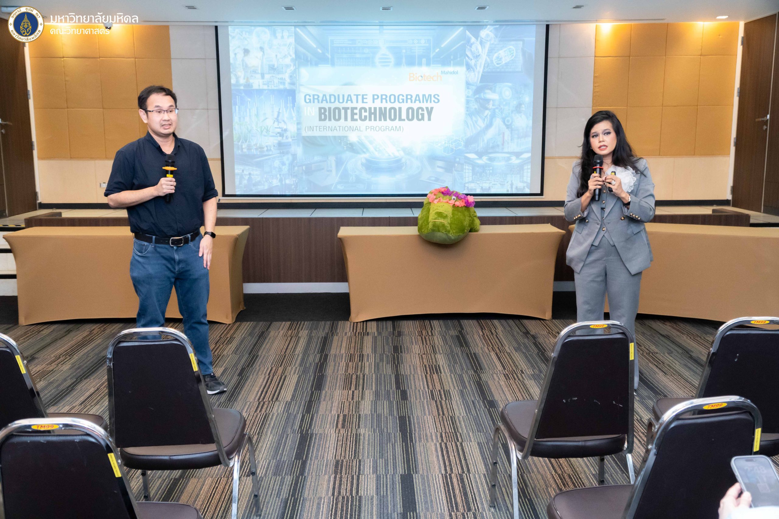 กิจกรรมในครั้งนี้ได้รับเกียรติจาก รองศาสตราจารย์ ดร.ชูวงศ์ เอื้อสุขอารี หัวหน้าภาควิชาภาควิชาเทคโนโลยีชีวภาพ เป็นประธานกล่าวเปิดงาน และคณาจารย์ในภาควิชาเทคโนโลยีชีวภาพร่วมแนะนำตัวและความเชี่ยวชาญด้านการวิจัยของแต่ละท่าน ซึ่งครอบคลุมในหลายประเด็น เช่น การเพิ่มมูลค่าผลพลอยได้ (By-product) ในอุตสาหกรรม ไปจนถึงการขยายขนาดการผลิตหรือพัฒนาสินค้าจากการทดลองในห้องปฏิบัติการ (Lab Scale) ไปสู่การผลิตจริงในระดับอุตสาหกรรม (Commercial Scale) การใช้ประโยชน์จากความหลากหลายทางชีวภาพอย่างยั่งยืน การวิจัยและพัฒนาอาหารแห่งอนาคต การพัฒนาวัคซีนและการค้นหาตัวยารักษาโรค เป็นต้น และยังได้รับเกียรติจาก รองศาสตราจารย์ ดร.ณัฏฐวี เนียมศิริ ประธานหลักสูตรระดับปริญญาโทและปริญญาเอก และรองศาสตราจารย์ ดร.ธวัชชัย ชัยจรัสพงษ์ เลขานุการหลักสูตรระดับปริญญาโทและปริญญาเอก ร่วมแนะนำหลักสูตรและรูปแบบการเรียนการสอนในระดับบัณฑิตศึกษาของภาควิชาเทคโนโลยีชีวภาพ รวมไปถึงหลักสูตรแบบ Dual Degree ทุนการศึกษา การทำวิจัยระยะสั้นกับมหาลัยความร่วมมือต่างประเทศ
