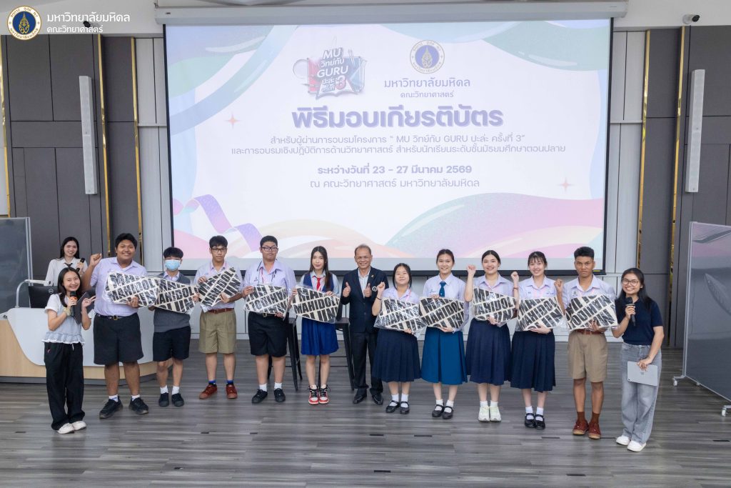 23 – 27 มีนาคม 2569 คณะวิทยาศาสตร์ มหาวิทยาลัยมหิดล นำโดย หน่วยนวัตกรรมการศึกษา งานจัดการข้อมูลและห้องสมุดสตางค์ มงคลสุข จัดโครงการ “MU วิทย์กับ GURU ปะล่ะ ครั้งที่ 3” ณ คณะวิทยาศาสตร์ มหาวิทยาลัยมหิดล วิทยาเขตพญาไท โดยมีวัตถุประสงค์เพื่อส่งเสริมให้นักเรียนในระดับมัธยมศึกษา ได้เกิดการเรียนรู้ผ่านประสบการณ์ตรง และได้ร่วมค้นหาความสนใจของตนเองในด้านวิทยาศาสตร์ อีกทั้งยังเพื่อเป็นการเตรียมความพร้อมสำหรับการแข่งขันเพื่อเข้าสู่การเรียนในระดับอุดมศึกษา ซึ่งภายในโครงการนักเรียนจะได้รับความรู้ในสาขาวิชาคณิตศาสตร์ ฟิสิกส์ เคมี ชีววิทยา สรีรวิทยา จุลชีววิทยา เภสัชวิทยา จากคณาจารย์ผู้เชี่ยวชาญของคณะวิทยาศาสตร์ และการฝึกปฏิบัติจริงภายในห้องปฏิบัติการ