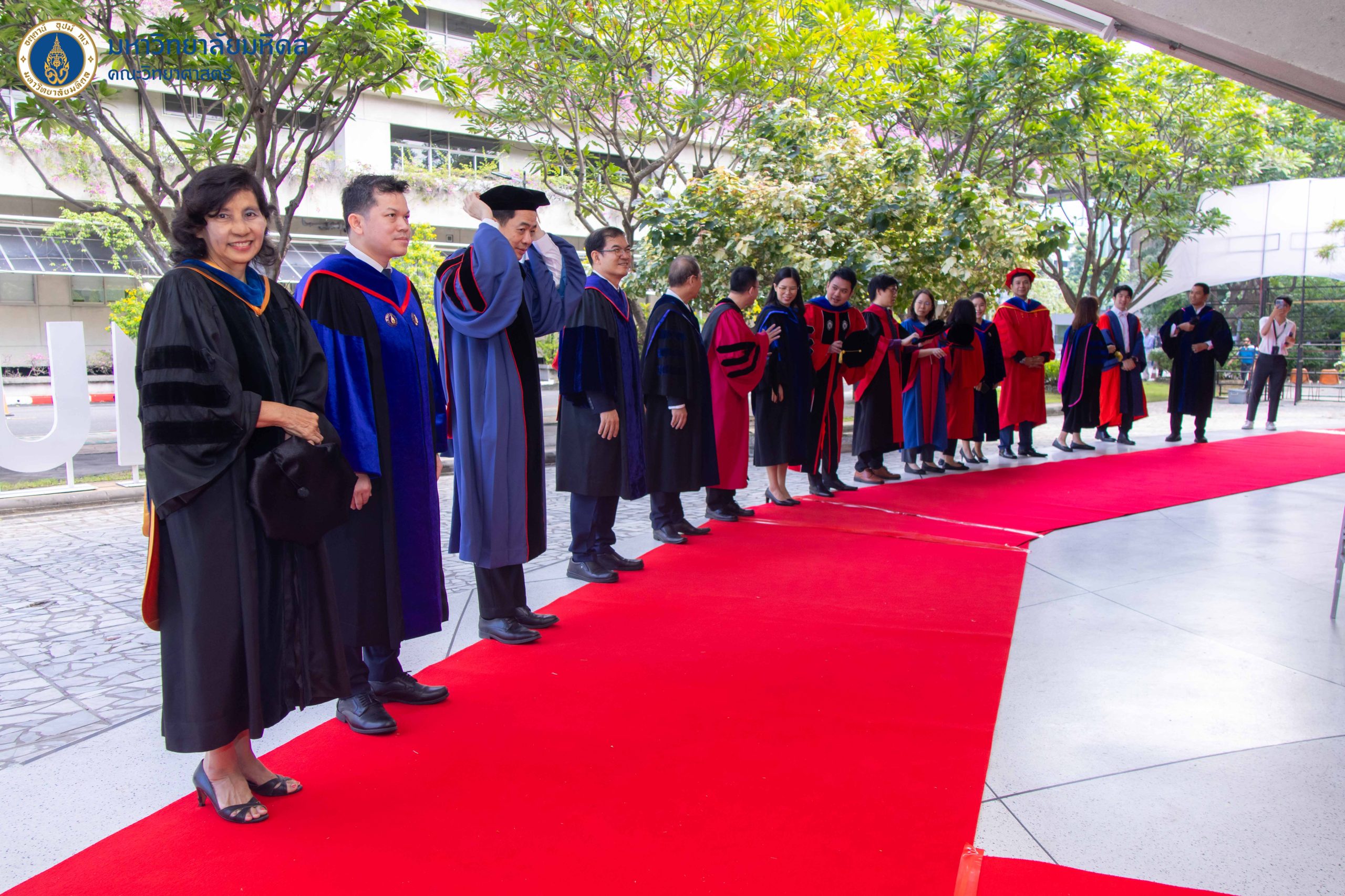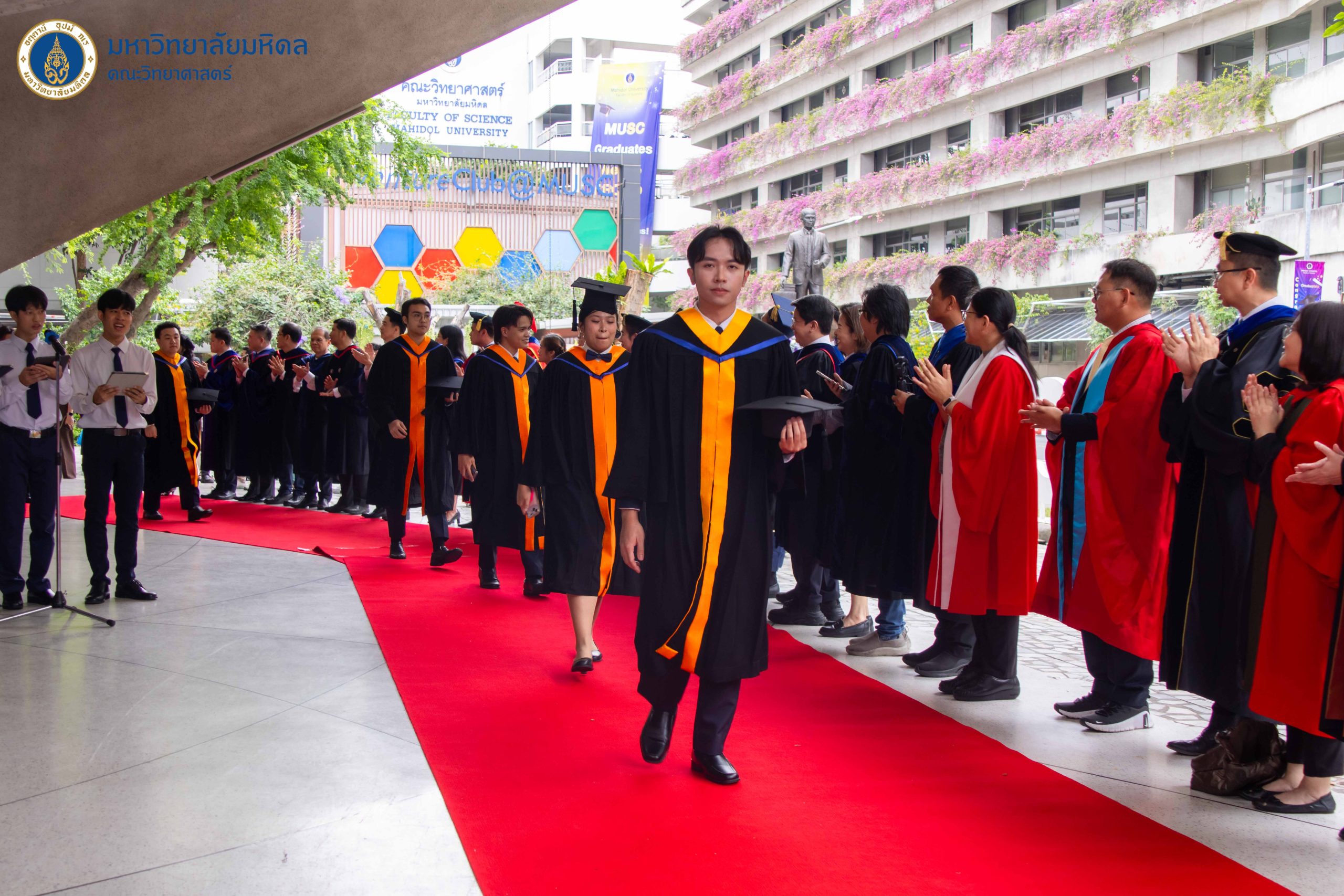 จากนั้นบัณฑิตจึงเดินออกจากห้องบรรยาย L01 สู่เส้นทางแห่งความยินดี และลอดซุ้มดอกไม้ เพื่อไปสู่พื้นที่ถ่ายภาพที่ระลึกผู้สำเร็จการศึกษาบริเวณลานตึกกลม โดยมี คณะผู้บริหาร คณาจารย์ และบุคลากรงานการศึกษา รวมถึงภาควิชา และกลุ่มสาขาวิชาต่าง ๆ ตั้งแถวปรบมือให้แก่บัณฑิต และมีคณะนักร้องประสานเสียงแห่งมหาวิทยาลัยมหิดล (Mahidol University Choir) หรือ MU Choir ขับร้องบทเพลงแสนไพเราะตลอดเส้นทาง
