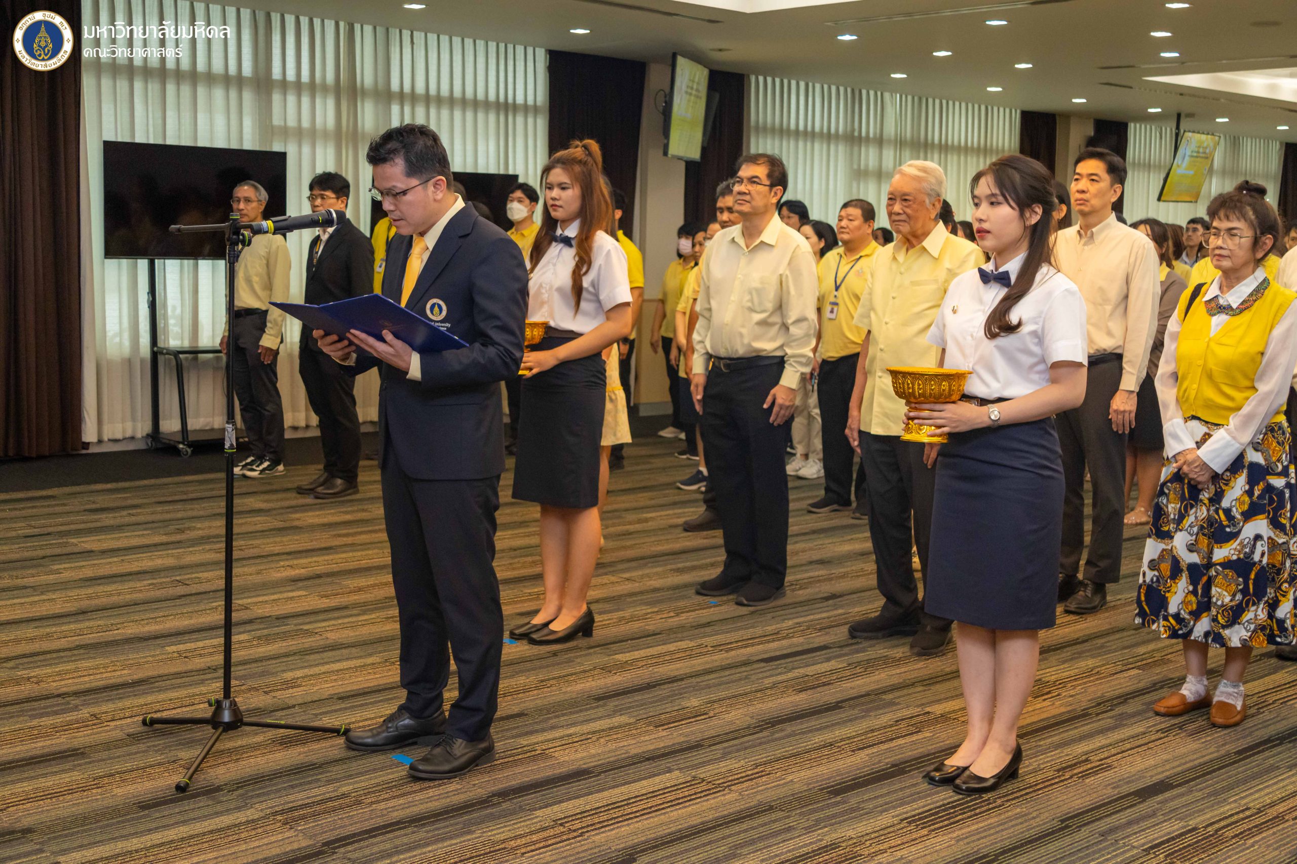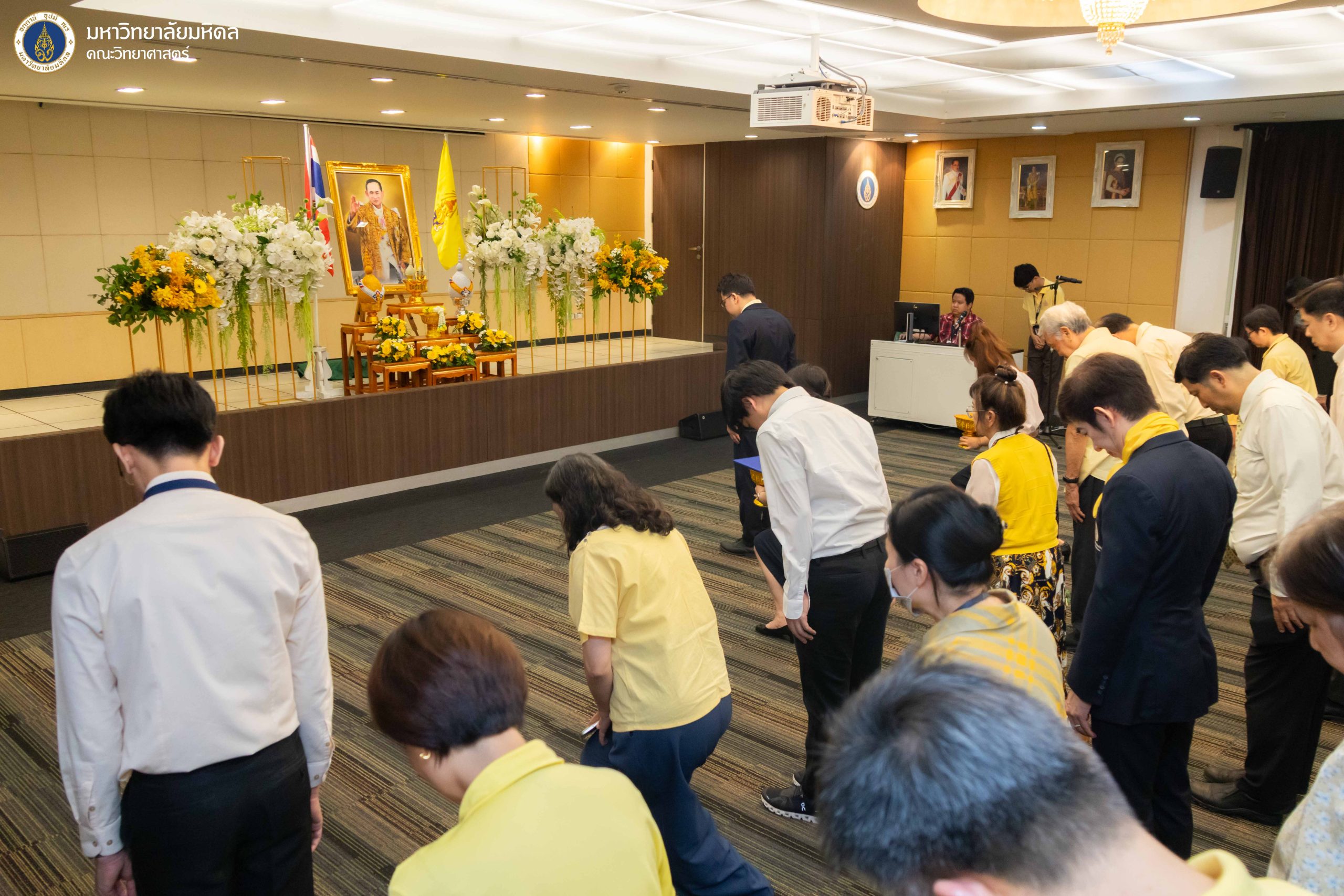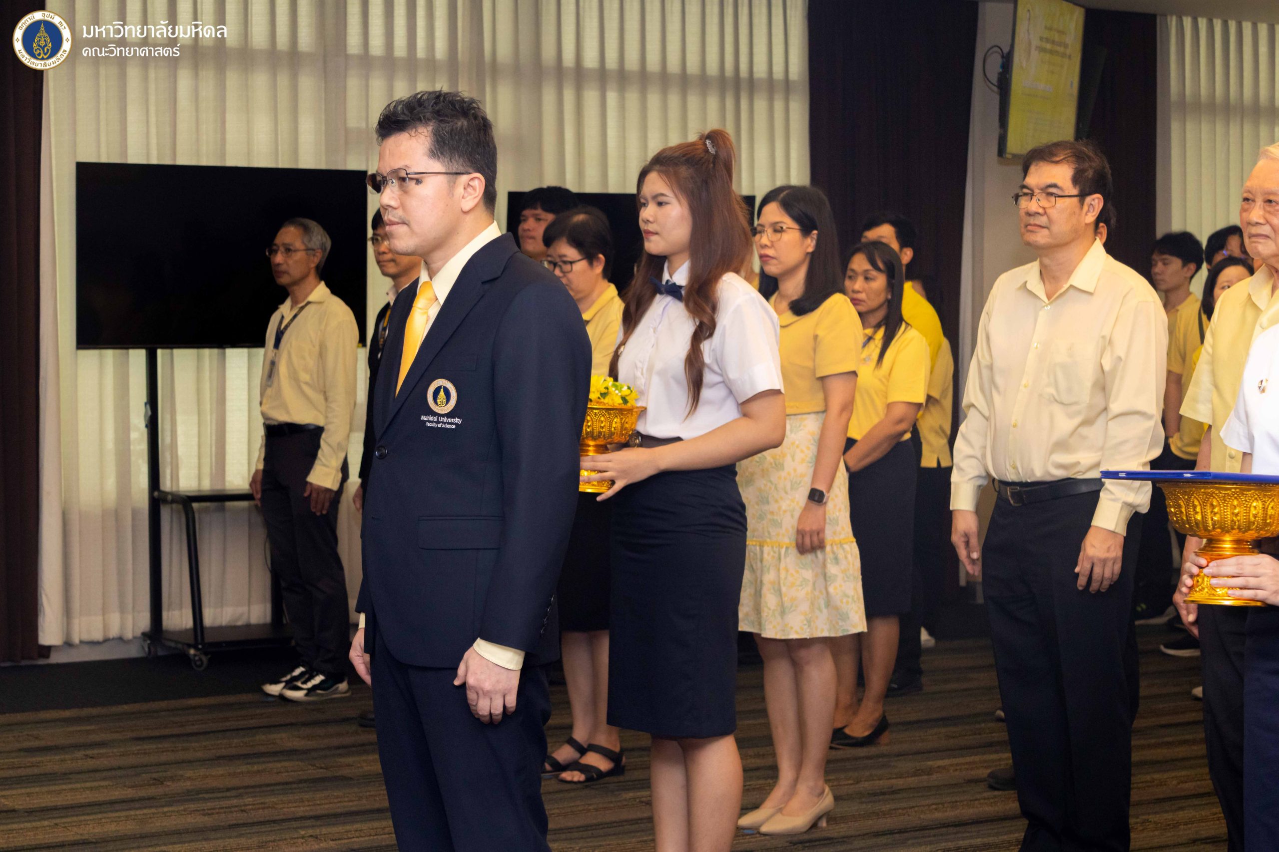 8 ตุลาคม 2568 คณะวิทยาศาสตร์ มหาวิทยาลัยมหิดล นำโดย รองศาสตราจารย์ ดร.ประสิทธิ์ สุวรรณเลิศ คณบดี พร้อมด้วยคณาจารย์ และบุคลากร แต่งกายด้วยชุดสุภาพโทนสีเหลือง แสดงความสำนึกในพระมหากรุณาธิคุณ ร่วมพิธีน้อมรำลึกในพระมหากรุณาธิคุณ เนื่องในวันนวมินทรมหาราช 13 ตุลาคม 2568 โดยพร้อมใจแสดงความสำนึกในพระมหากรุณาธิคุณ ร้องเพลงเดินตามรอยเท้าพ่อร่วมกัน ณ ห้องประชุมอาคารสตางค์ มงคลสุข คณะวิทยาศาสตร์ มหาวิทยาลัยมหิดล พญาไท