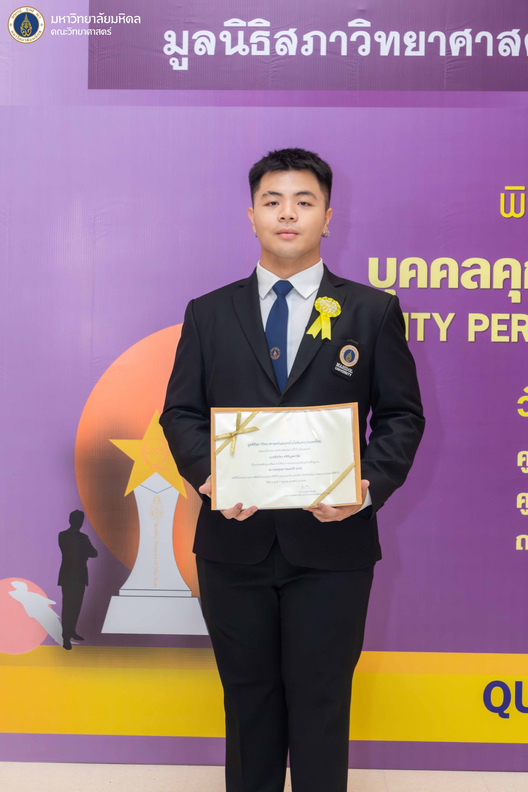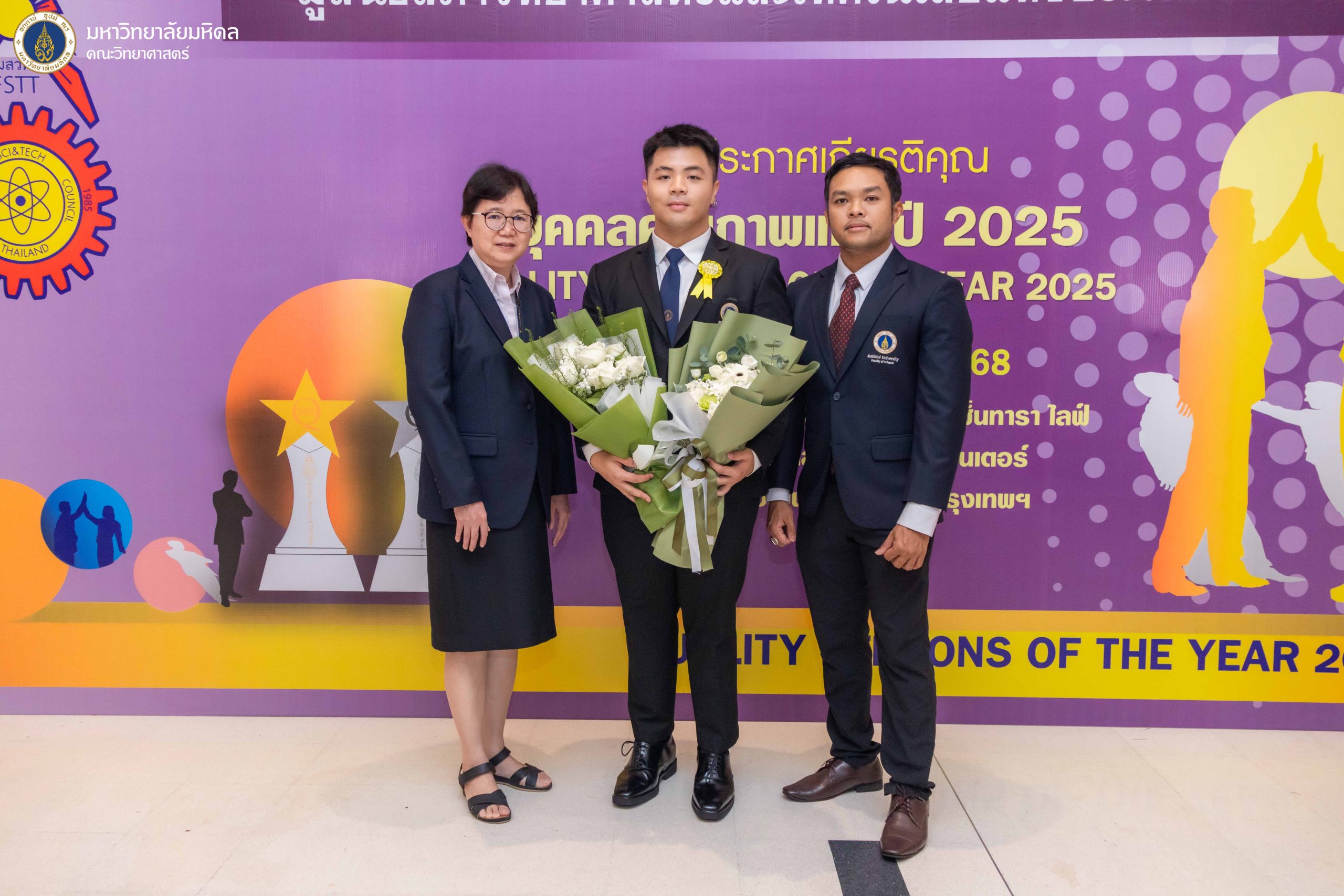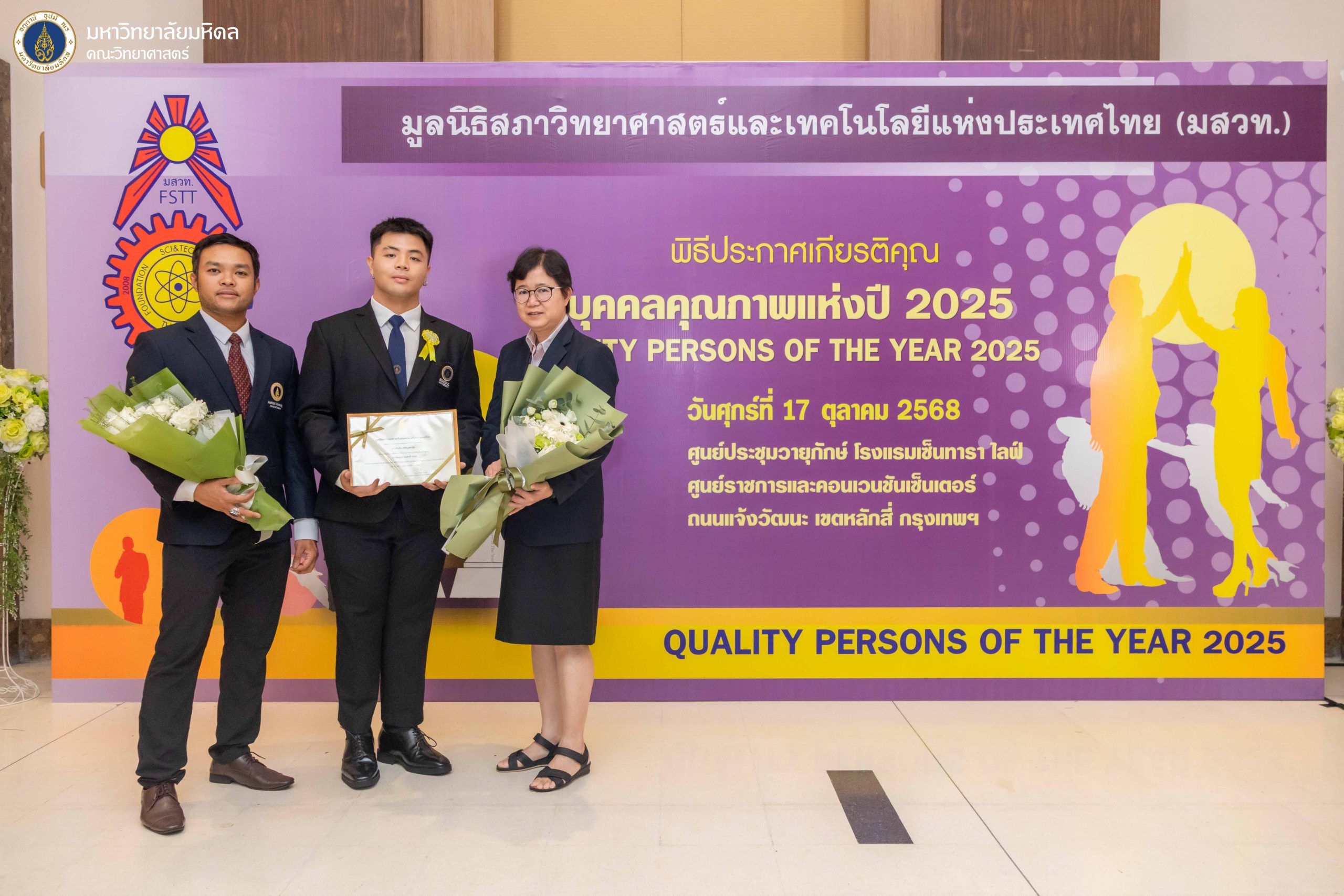 17 ตุลาคม 2568 คณะวิทยาศาสตร์ มหาวิทยาลัยมหิดล นำโดย รองศาสตราจารย์ ดร.กรกนก บุญวงษ์ ผู้ช่วยคณบดีฝ่ายการศึกษา, รองศาสตราจารย์ ดร.ปฐมพงษ์ แสงวิไล ผู้แทนอาจารย์จากภาควิชาชีววิทยา และประธานหลักสูตรวิทยาศาสตรบัณฑิต สาขาวิชาทรัพยากรชีวภาพและชีววิทยาสภาวะแวดล้อม (หลักสูตรนานาชาติ) หรือ Bioresources and Environmental Biology (SCBE) พร้อมด้วย นายพุฒิพงศ์ มาตย์จันทร์ นักวิชาการศึกษา สังกัดงานการศึกษา สำนักงานคณบดี เข้าร่วมพิธีประกาศเกียรติคุณ “บุคคลคุณภาพแห่งปี 2025” (Quality Persons of The Year 2025) พร้อมร่วมแสดงความยินดีแก่นักศึกษาที่ได้รับ “ทุนเยาวชนคุณภาพแห่งปี 2025” (Quality Youths Scholarship of The Year 2025) ซึ่งจัดโดย มูลนิธิสภาวิทยาศาสตร์และเทคโนโลยีแห่งประเทศไทย (มสวท.) ณ วายุภักษ์ ฮอลล์ ชั้น 5 ศูนย์ประชุมวายุภักษ์ โรงแรมเซ็นทารา ไลพ์ ศูนย์ราชการและคอนเวนชันเซ็นเตอร์ ถนนแจ้งวัฒนะ เขตหลักสี่ กรุงเทพฯ