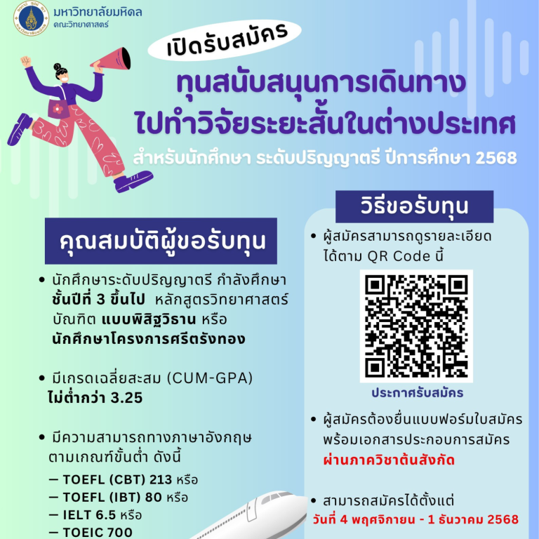 คณะวิทยาศาสตร์ มหาวิทยาลัยมหิดล เปิดรับสมัครผู้สนใจขอรับทุนสนับสนุนการเดินทาง ไปทำวิจัยระยะสั้นในต่างประเทศ สำหรับนักศึกษา ระดับปริญญาตรี ปีการศึกษา 2568