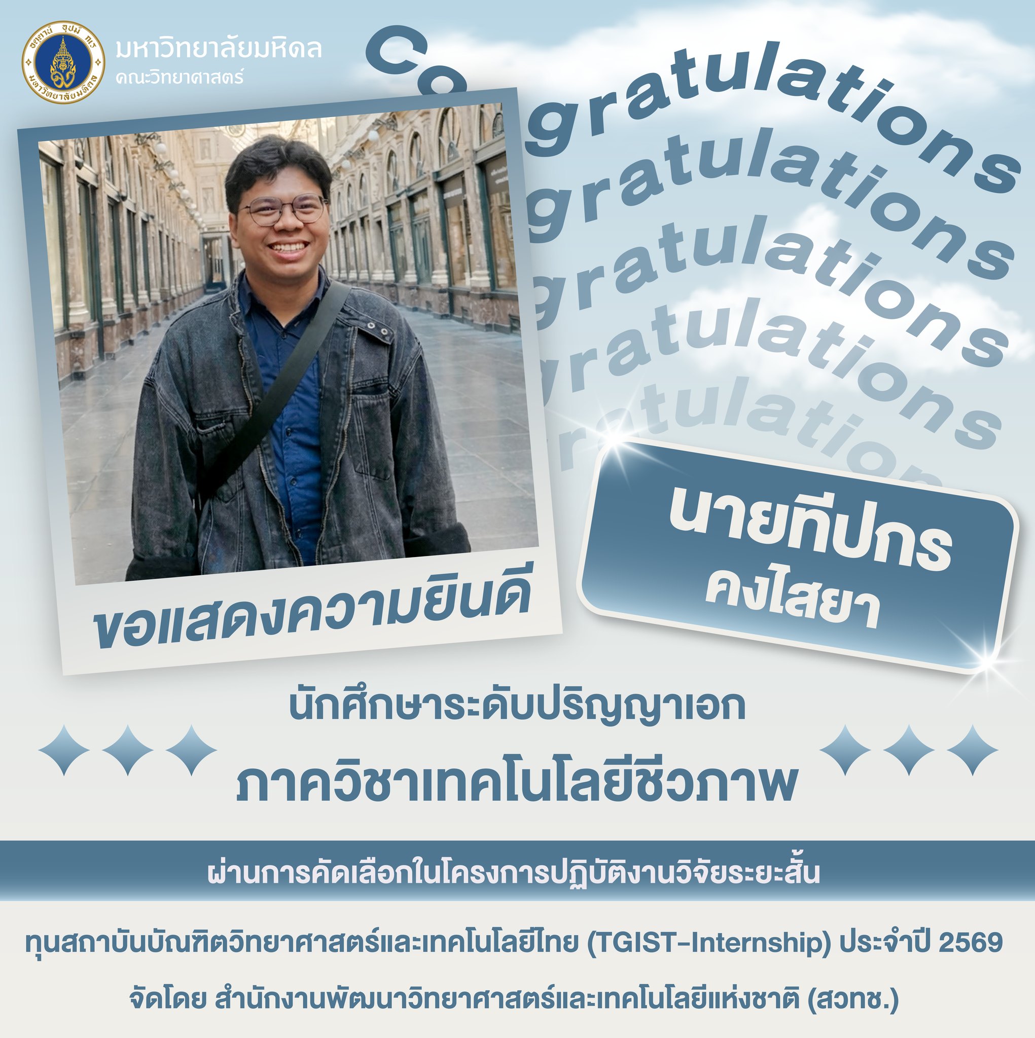 ผ่านการคัดเลือกในโครงการปฏิบัติงานวิจัยระยะสั้น ทุนสถาบันบัณฑิตวิทยาศาสตร์และเทคโนโลยีไทย (TGIST-Internship) ประจำปี 2569 จัดโดย สำนักงานพัฒนาวิทยาศาสตร์และเทคโนโลยีแห่งชาติ (สวทช.)