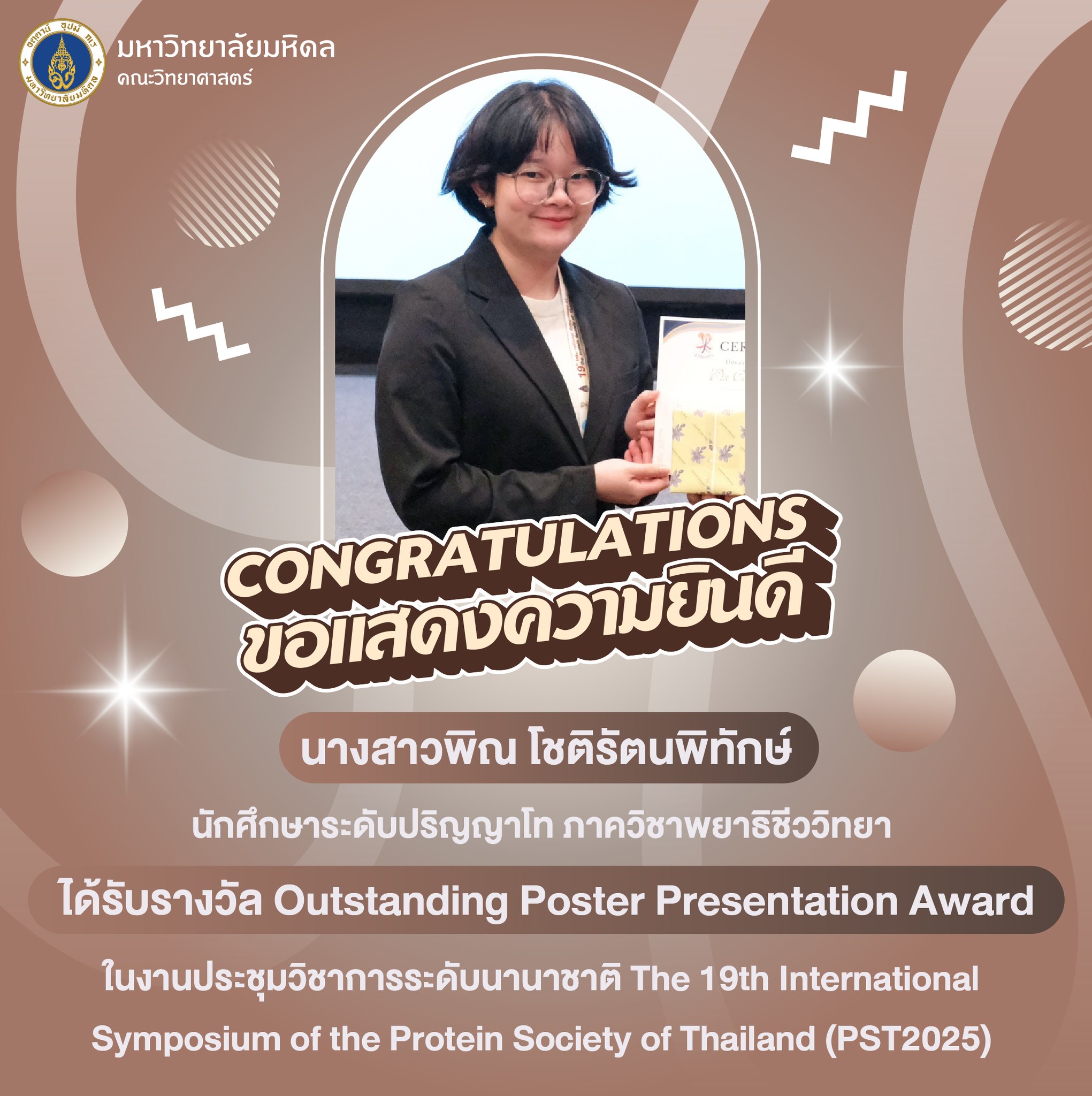 ได้รับรางวัล Outstanding Poster Presentation Award ในงานประชุมวิชาการระดับนานาชาติ The 19th International Symposium of the Protein Society of Thailand (PST2025)