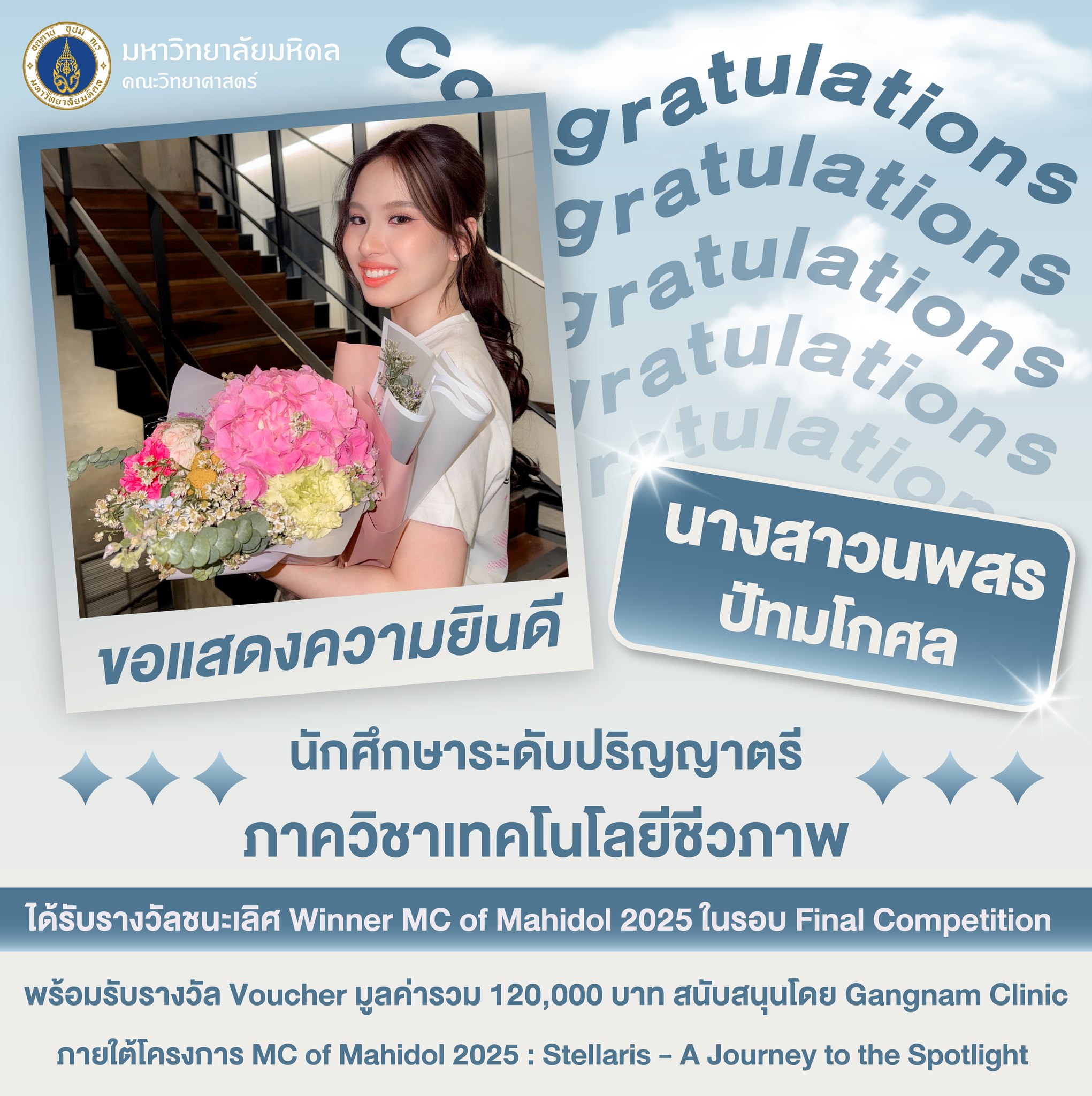ได้รับรางวัลชนะเลิศ Winner MC of Mahidol 2025 ในรอบ Final Competition พร้อมรับรางวัล Voucher มูลค่ารวม 120,000 บาท สนับสนุนโดย Gangnam Clinic